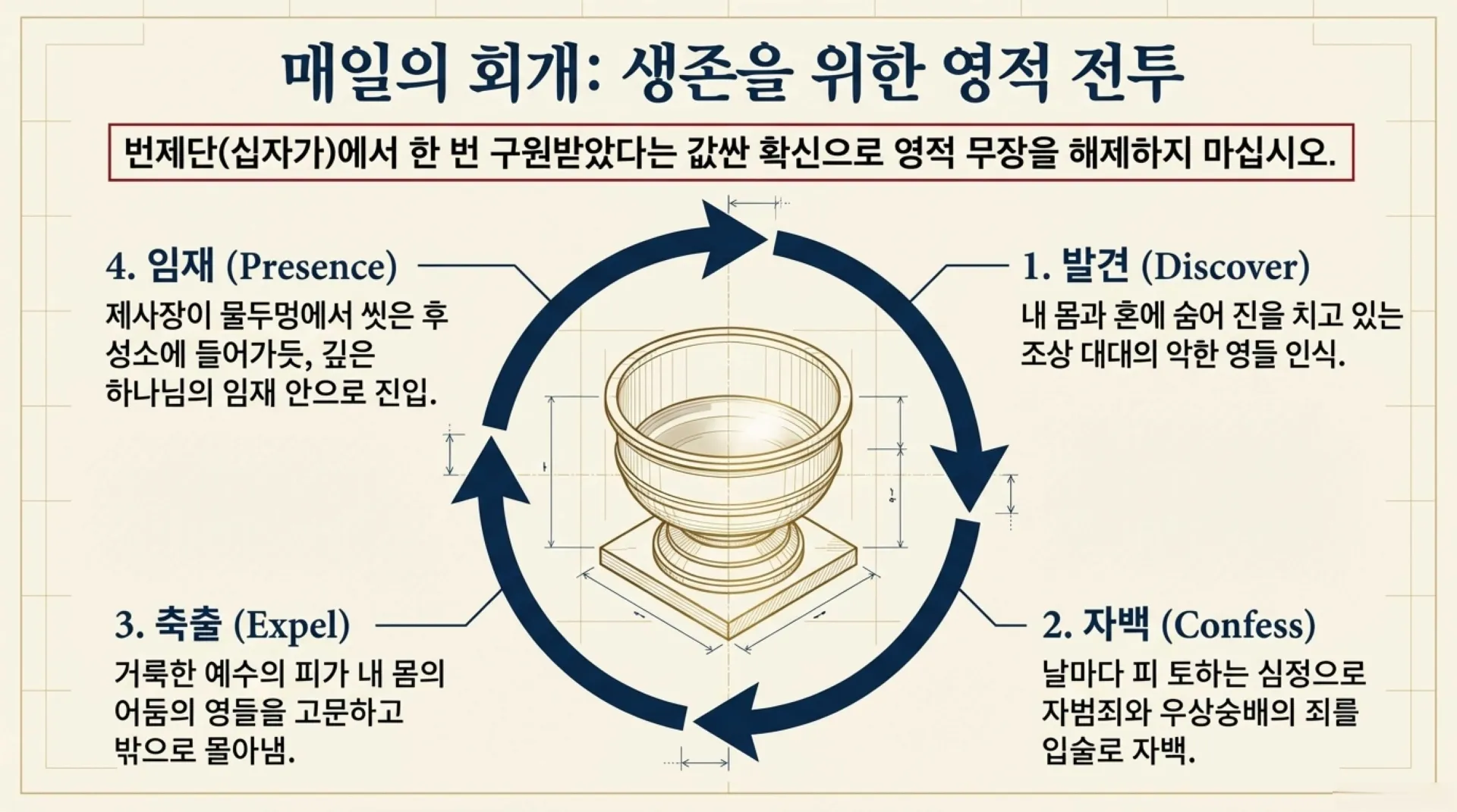 우리 믿는 이들이 비록 번제단에서 십자가의 은혜로 죄를 덮음 받는 속죄를 받았었을지라도, 내 몸과 혼과 영의 지성소까지 온전히 깨끗해진 것은 아니다. 한 번 구원받았다는 값싼 확신에 속아 영적 무장을 해제한다면, 조상 대대로 내 핏 속에 들어와 견고하게 진을 치고 있는 악한 영들은 결코 스스로 나가지 않는다. 구약의 제사장들이 성소에 들어가기 전 매일 물두멍에서 수족을 씻어야 했듯이, 이제는 우리도 날마다 피 토하는 심정으로 회개하여 내 안에 숨어 들어온 더러운 귀신들을 예수 피로 씻어내야만 한다.