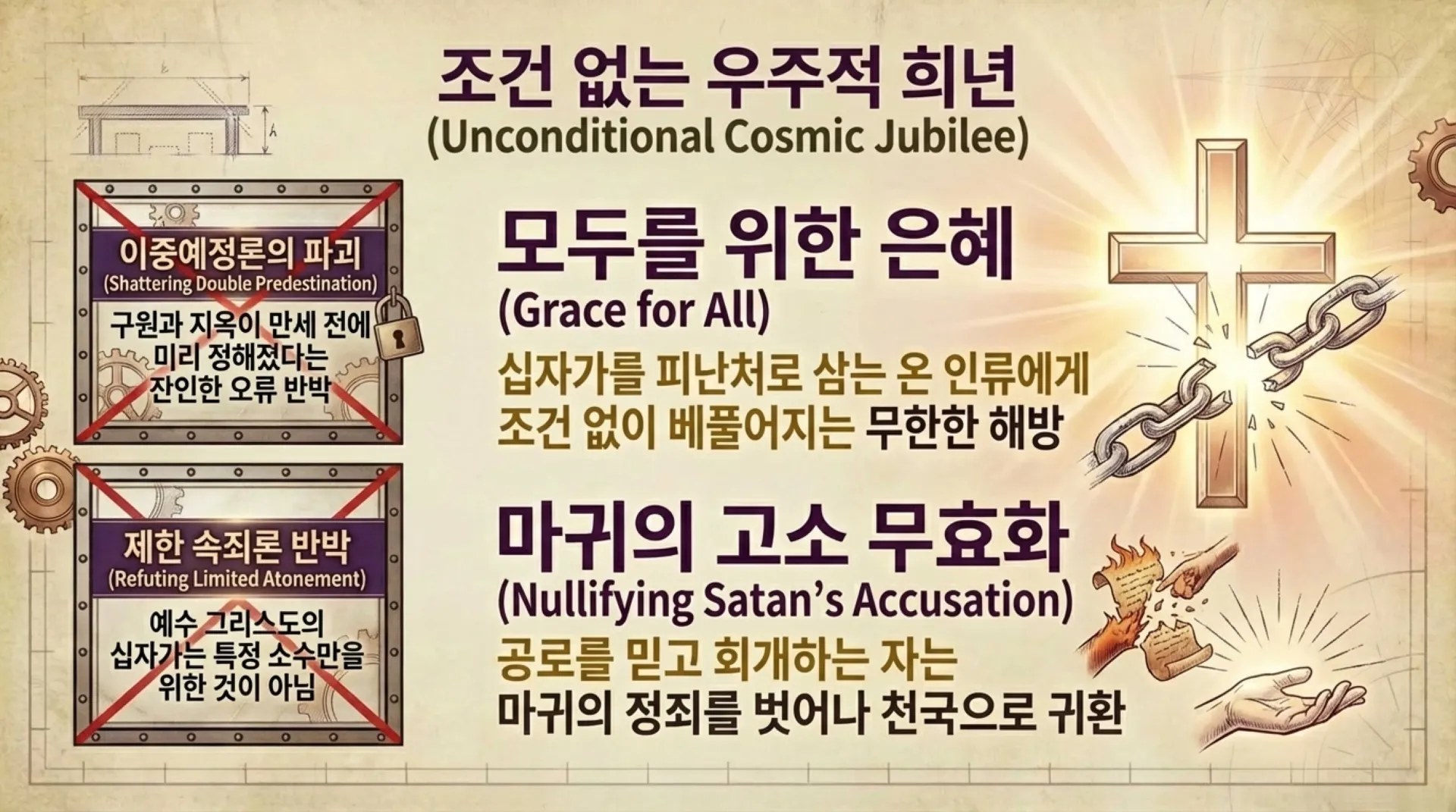 우리는 구약의 대제사장 아론이 수행했던 네 가지 고유 직무가, 장차 오실 예수 그리스도의 십자가와 부활 사역을 통해 어떻게 소름 끼치도록 완벽하게 성취되었는지를 살펴보았다. 예수님은 친히 자신을 찢어 대속죄일의 희생 제물이자 정결의 피가 되셨고, 우림과 둠밈처럼 완전한 진리와 공의로 세상을 심판하실 권세를 얻으셨으며, 승천하시며 제자들에게 하늘의 축복을 쏟아부어 주셨고, 마침내 당신의 죽음으로 도피성에 갇힌 우리를 율법과 마귀의 압제에서 영원히 해방하셨다.