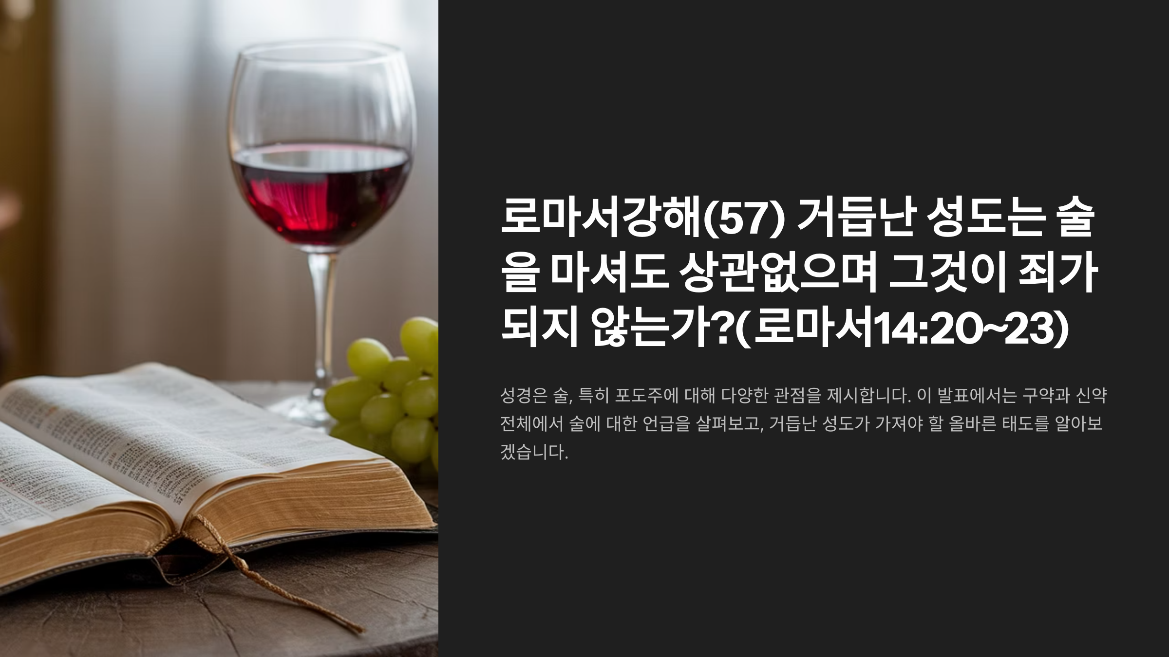 제목: [로마서강해(57)] 거듭난 성도는 술을 마셔도 상관없으며 그것이 죄가 되지 않는가?(로마서14:20~23)_2025-07-03(목)