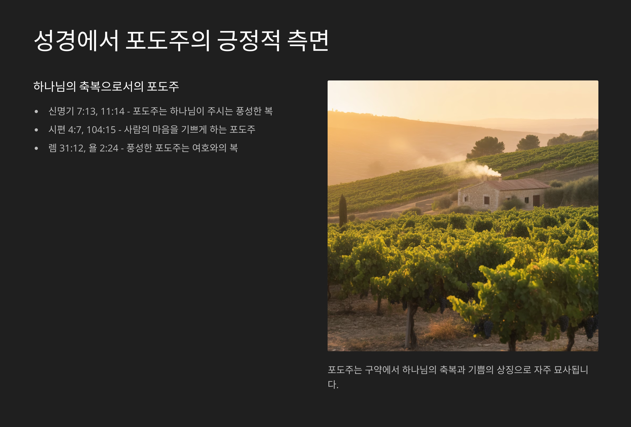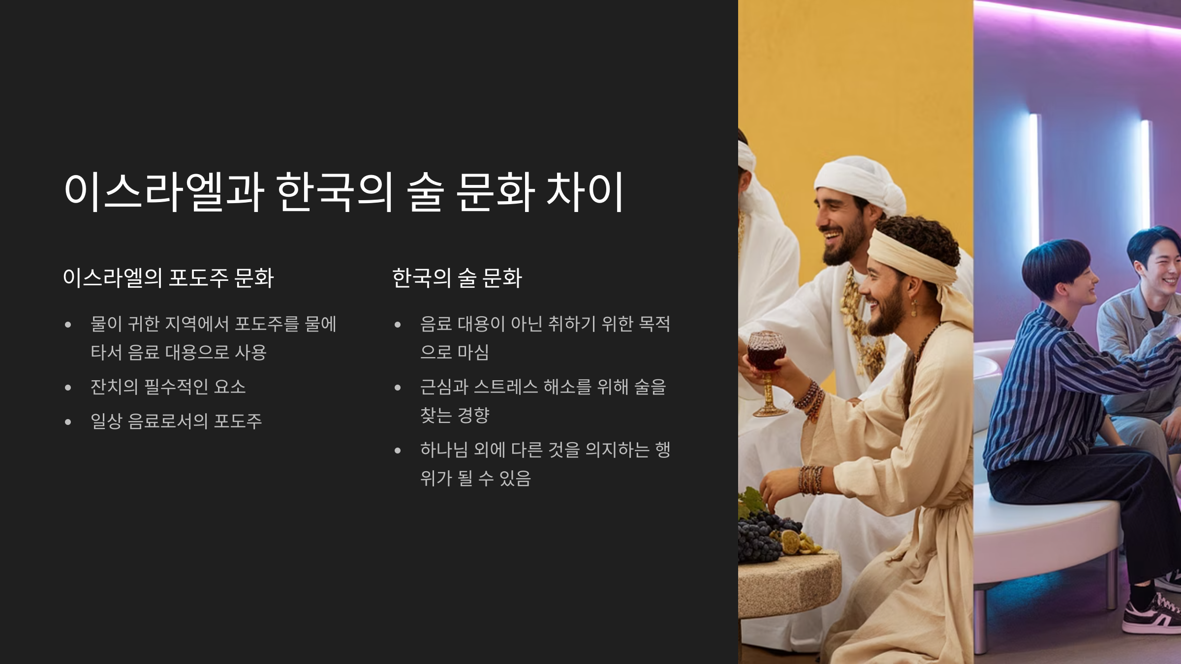 그렇다면 성경이 쓰여지고 있던 시대의 음주 문화와 현대 한국 음주 문화는 같은가 다른가? 결론적으로 둘 사이에는 엄청나게 큰 차이가 존재하고 있다. 예를 들어보자. 이스라엘은 물이 귀한 지역이었기 때문에 포도주를 물에 타서 음료 대용으로 마시는 문화가 있었고, 잔치에 포도주는 필수적인 요소였다 . 상대방의 적을 무찌르기도 했다. 이스라엘에 있어서 포도주는 일상음료였던 것이다.