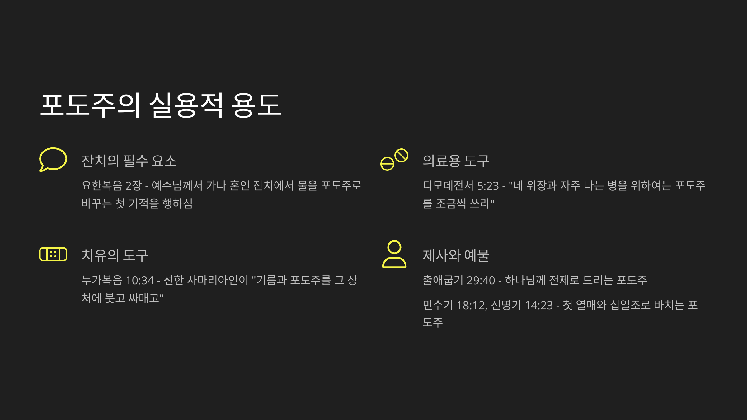 이와같이 포도주는 흥겨운 잔치의 필수적인 요소일 뿐만 아니라, 위장병을 치료할 수 있는 의료용 도구일 수도 있고(딤전5:23) 상처를 싸매고 치유하는 도구로 쓰일 수도 있다(눅10:34). 그러므로 풍성한 포도주는 여호와의 복이라고 성경이 말씀하고 있는 것이다(렘31:12, 욜2:24).