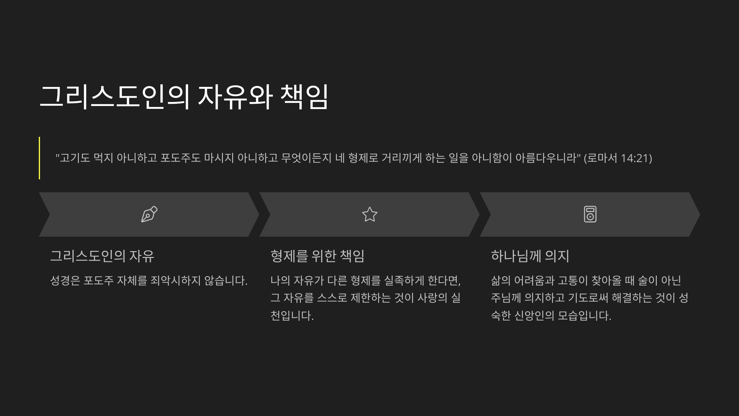 그러나 술에 있어서 매우 중요한 원칙은 로마서 14장 21절에 나오는 바, 인간의 자유의지의 한계에 와 있다. 즉 "고기도 먹지 아니하고 포도주도 마시지 아니하고 무엇이든지 네 형제로 거리끼게 하는 일을 아니함이 아름다우니라"고 말씀하고 있기 때문이다. 즉, 나의 자유가 다른 형제를 실족하게 하는 원인이 된다면, 그 자유를 스스로 제한하는 것이 사랑의 실천이며 더 아름다운 일이라는 것이다. 따라서, 거듭난 그리스도인은 술을 마시지 않는 것이 지혜로운 선택이다. 삶의 어려움과 고통이 찾아올 때 술이 아닌 주님께 의지하고 기도로써 해결하는 것이 성숙한 신앙인의 모습인 것이다.