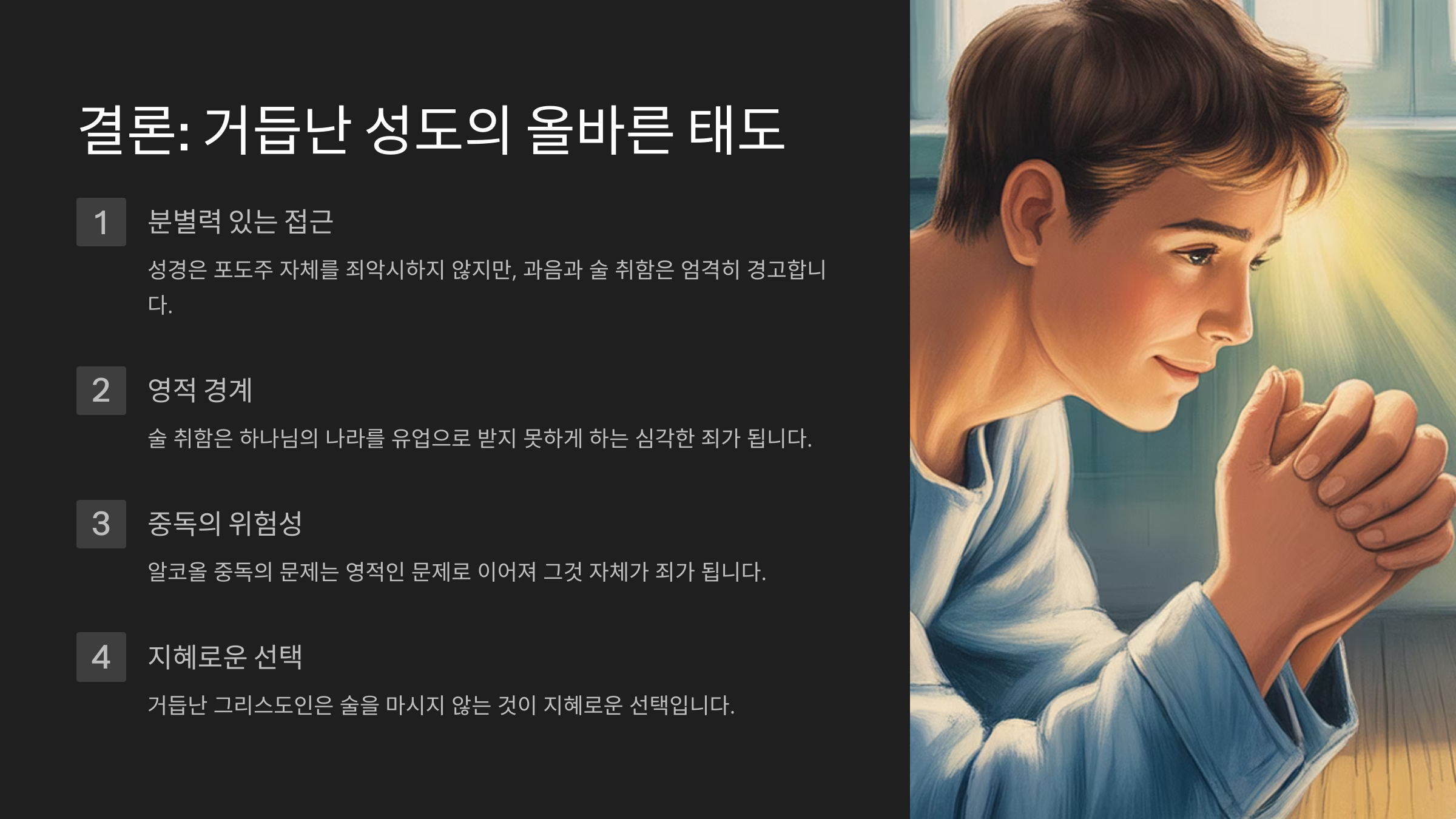 이 모든 성경적 고찰을 종합하여 볼 때 우리는 다음과 같은 결론을 내릴 수 있다. 첫째, 성경은 포도주 자체를 죄악시하지 않지만, 과음과 술 취함은 엄격히 경고하고 있다는 것이다. 둘째, 술 취함은 하나님의 나라를 유업으로 받지 못하게 하는 심각한 죄가 된다는 것이다. 그리고 셋째로, 알코올 중독의 문제는 영적인 문제로 이어져서 그것 자체가 죄가 된다는 것이다.