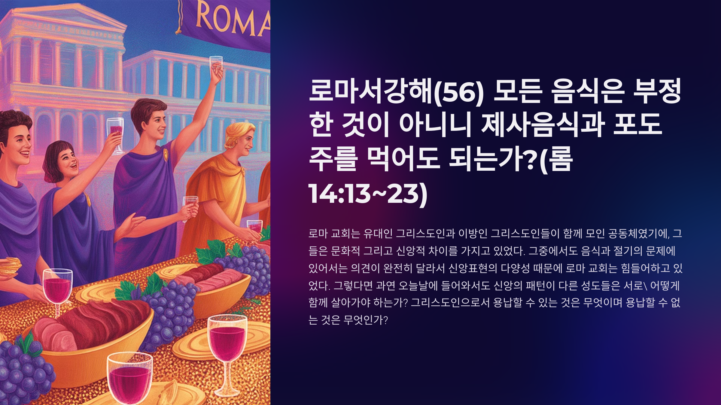제목: [로마서강해(56)] 모든 음식은 부정한 것이 아니니 제사음식과 포도주를 먹어도 되는가?(롬14:13~23)_2025-07-02(수)