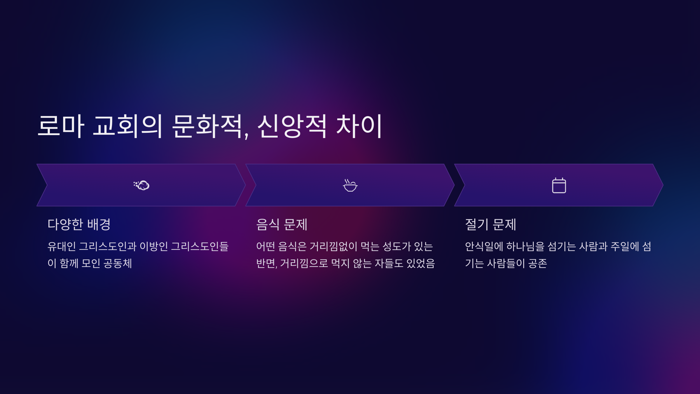 로마 교회는 유대인 그리스도인과 이방인 그리스도인들이 함께 모인 공동체였기에, 그들은 문화적 그리고 신앙적 차이를 가지고 있었다. 그런데 그중에서도 음식과 절기의 문제는 서로 다르게 지키고 있었다. 그런데 예수 그리스도를 구주로 믿고 따른다는 측면에서 그들은 모두 하나였다. 하지만 신앙 표현의 다양성 때문에 로마 교회는 매우 힘들어하고 있었다. 왜냐하면 먹는 문제를 놓고도 어떤 음식은 아무 거리낌없이 먹는 성도가 있었는가 하면, 반대로 어떤 음식은 거리낌으로 인하여 먹지 않는 자들도 있었기 때문이다. 또한 어떤 사람은 하나님을 섬기는 날짜를 안식일로 정하고 지키는 사람들이 있었는가 하면, 어떤 사람은 그 날짜를 주일로 정하고 지키는 사람들도 있었기 때문이다. 그렇다면 과연 오늘날에 들어와서도 신앙의 패턴이 다른 교우들과 우리는 어떻게 함께 살아가야 하는가? 이때에 그리스도인으로서 용납할 수 있는 것은 무엇이며 용납할 수 없는 것은 무엇인가?