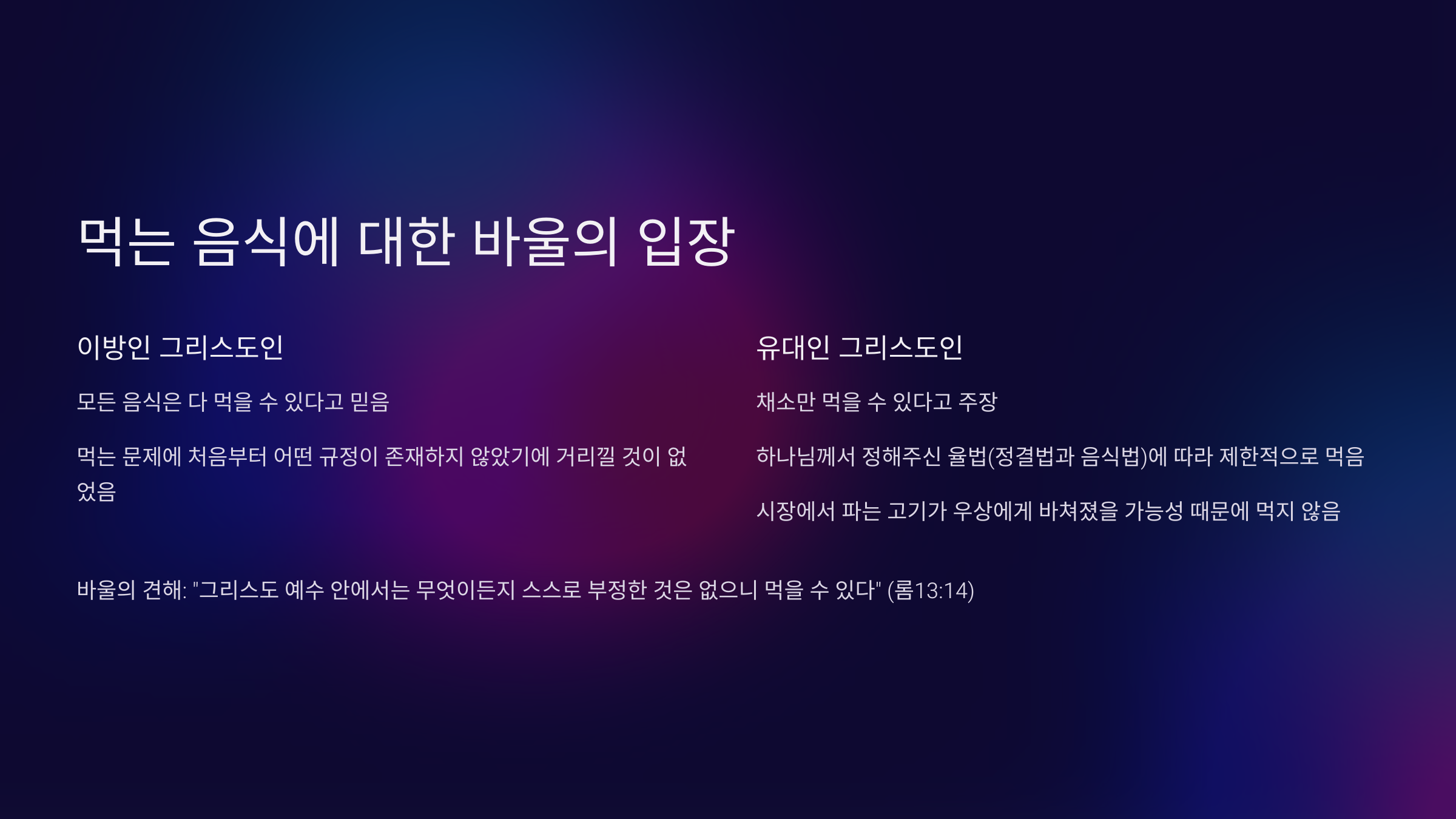 바울이 로마 교회에 편지를 쓸 당시에 시장에서 파는 고기는 로마인들이 자신의 신에게 우상숭배를 하고 바쳐진 음식이 시중에 나와서 통용되는 것도 있었다. 그러므로 유대인 그리스도인들은 아예 고기를 먹지 않았다. 그러나 그렇다고 해서 고기를 전혀 먹지 않고 살 수 있는가/ 과연 채소만으로 건강할 수 있는가? 가장 현명한 길은 둘 다를 적절히 먹는 것이다.