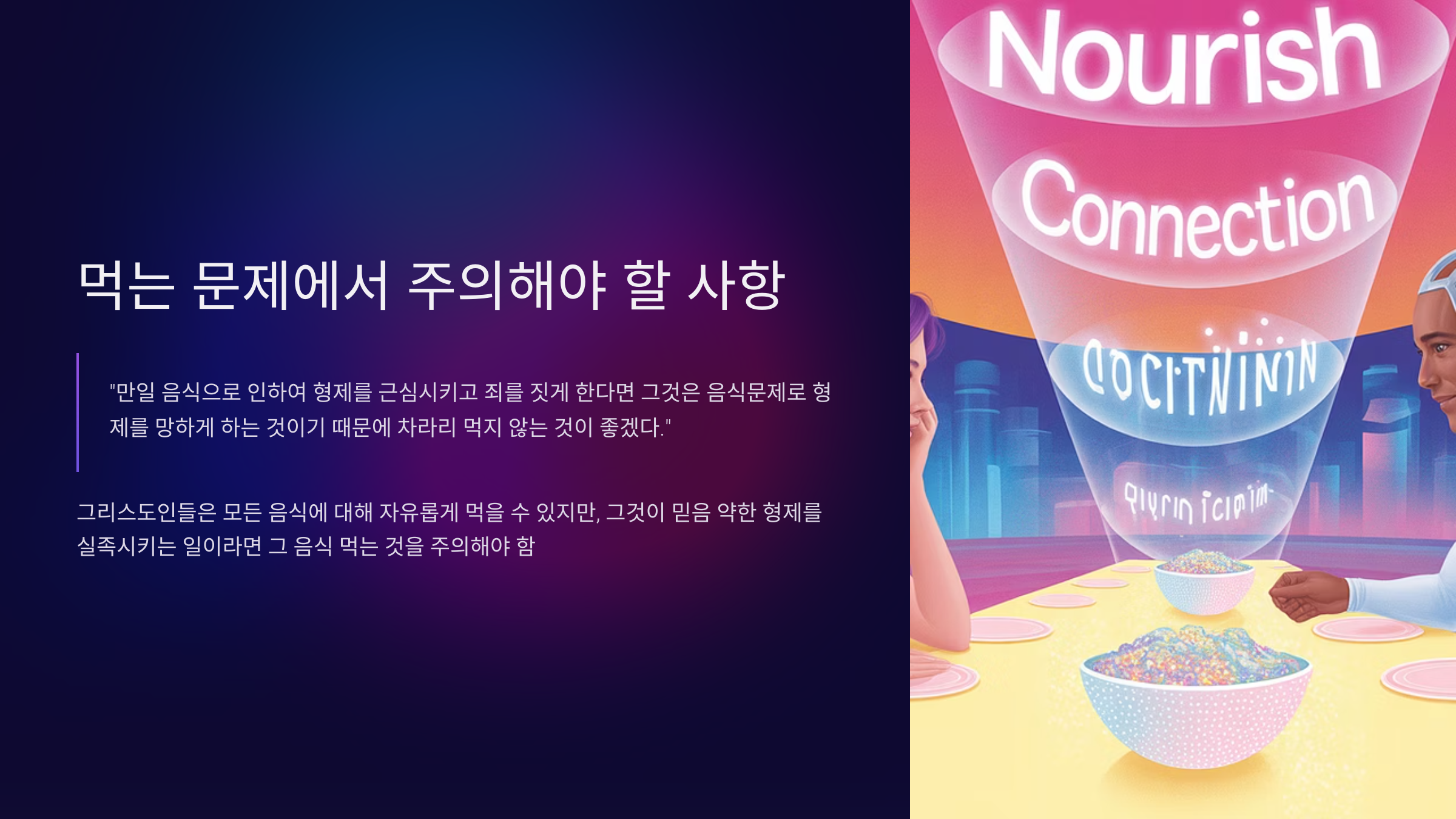 그러므로 그리스도인들은 모든 음식에 대해 자유롭게 먹을 수 있지만, 그것이 믿음 약한 형제를 실족시키는 일이라면 그 음식먹는 것을 주의해야 한다. 그렇다. 하나님께서 주신 음식은 오순절 이후 그 자체로는 아무런 문제가 되지 않는다. 하지만 그 음식을 먹는 것이 믿음 약한 형제의 양심을 해쳐서 실족하게 된다면, 그것을 먹지 않고 절제해야 한다는 것이 바울의 입장이다. 그렇다. 주 예수 그리스도를 자신의 구주로 믿고 회개하는 사람이라면, 먹는 문제에 있어서는 어떤 것이든 다 자유를 가지고 있다. 하지만 지체들의 연합체인 교회 공동체 내에서는 다른 사람을 배려하는 마음도 같이 필요한 것이다. 그리스도인이 가진 자유라고 할지라도 그것을 스스로 제한할 필요가 있는 것이다. 그것은 나를 위한 것이 아니라, 바로 다른 지체의 건덕을 위한 것이다.