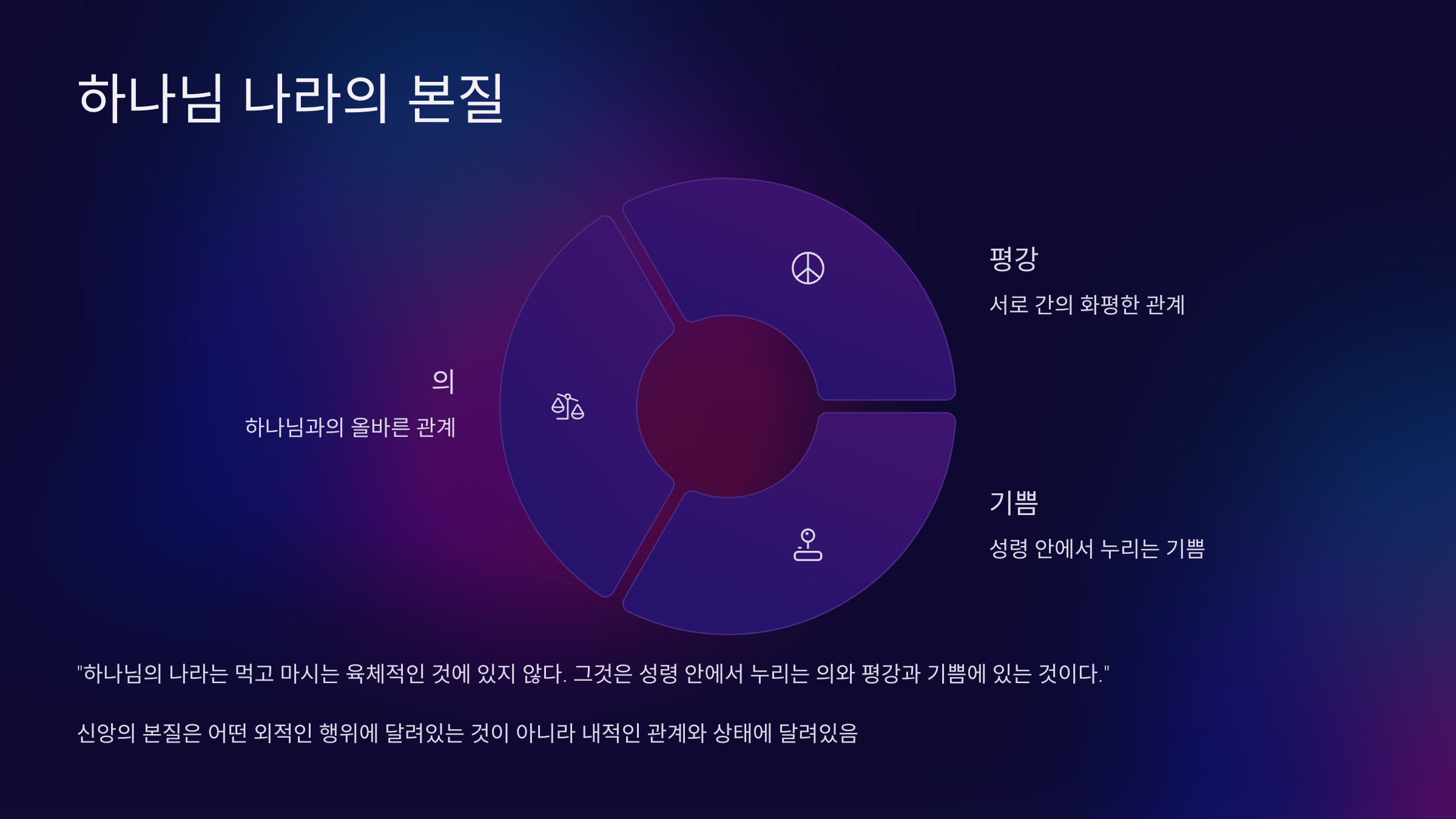 사실 이 세사에서의 하나님의 나라는 먹고 마시는 육체적인 것에 있지 않다. 그것은 성령 안에서 누리는 의와 평강과 기쁨에 있는 것이다. 그러므로 그리스도인은 먹는 문제에 있어서 어떤 것이 옳다고 너무 집착할 필요가 있다. 상대방을 그대로 인정하면 된다. 왜냐하면 먹어도 주님을 위해 먹는 것이고, 먹지 않아도 주님을 위해 먹지 않고 있기 때문이다. 신앙의 본질은 어떤 외적인 행위에 달려있는 것이 아니라 내적인 관계와 상태에 달려있는 것이다. 그러므로 오늘날 우리의 신앙 생활의 중심은 하나님과의 관계와 이웃과의 평화로운 관계에 있는 것이다. 그러므로 우리는 하나님께서 주신 자유를 누리되, 타인을 실족시키지 않도록 주의해야 하는 것이다. 사실 우상숭배와 음식의 관계는 양심의 문제이것이지, 결코 본질의 문제가 아닌 것이다. 그러므로 서로가 서로를 용납할 수 있어야 한다. 그리고 믿음이 약한 지체를 위해서는 자유를 스스로 절제할 필요가 있는 것이다. 사랑은 사랑은 자유보다 우선하기 때문이다.