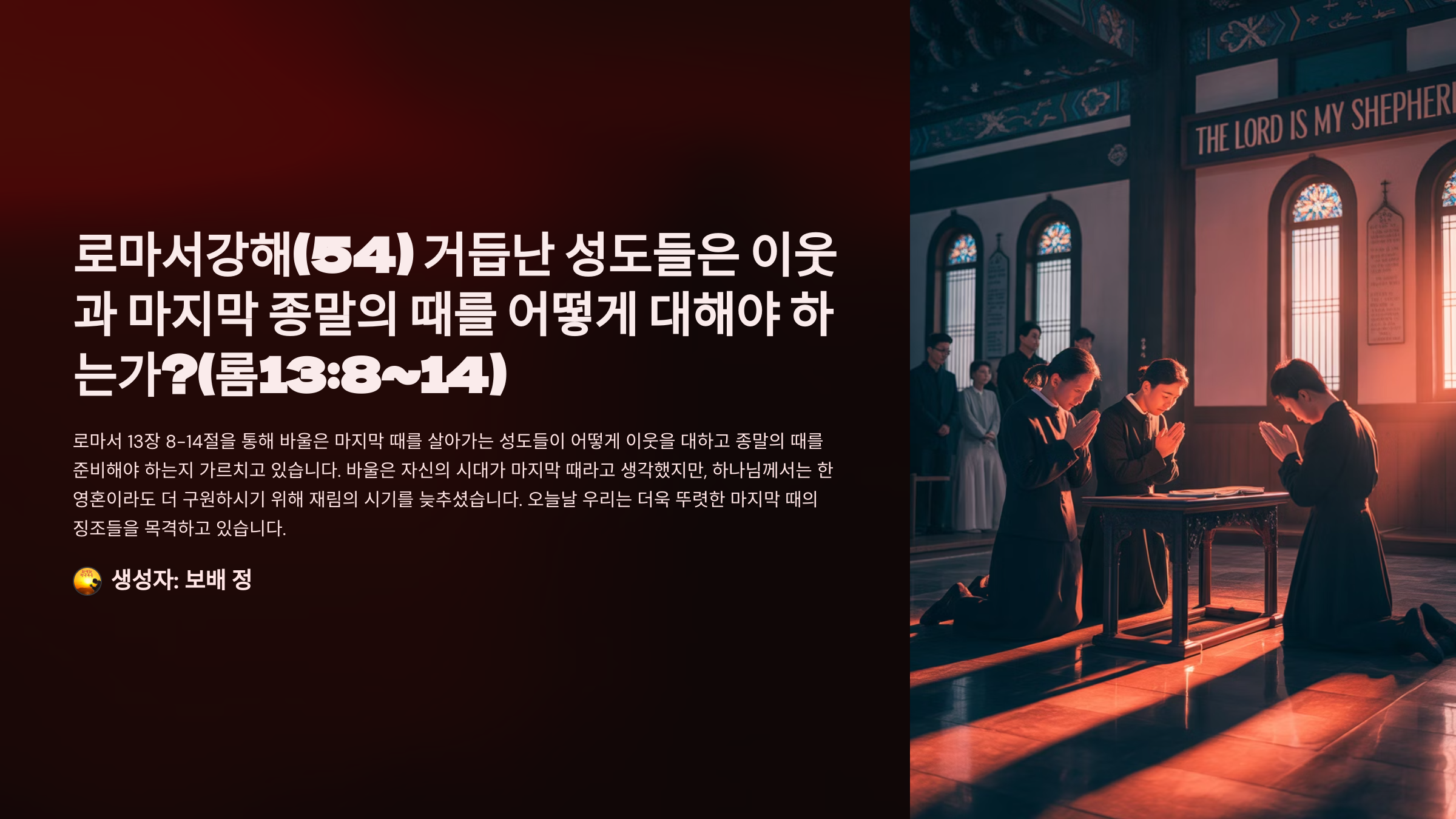 제목: [로마서강해(54)] 거듭난 성도들은 이웃과 마지막 종말의 때를 어떻게 대해야 하는가?(롬13:8~14)_2025-06-30(금)
