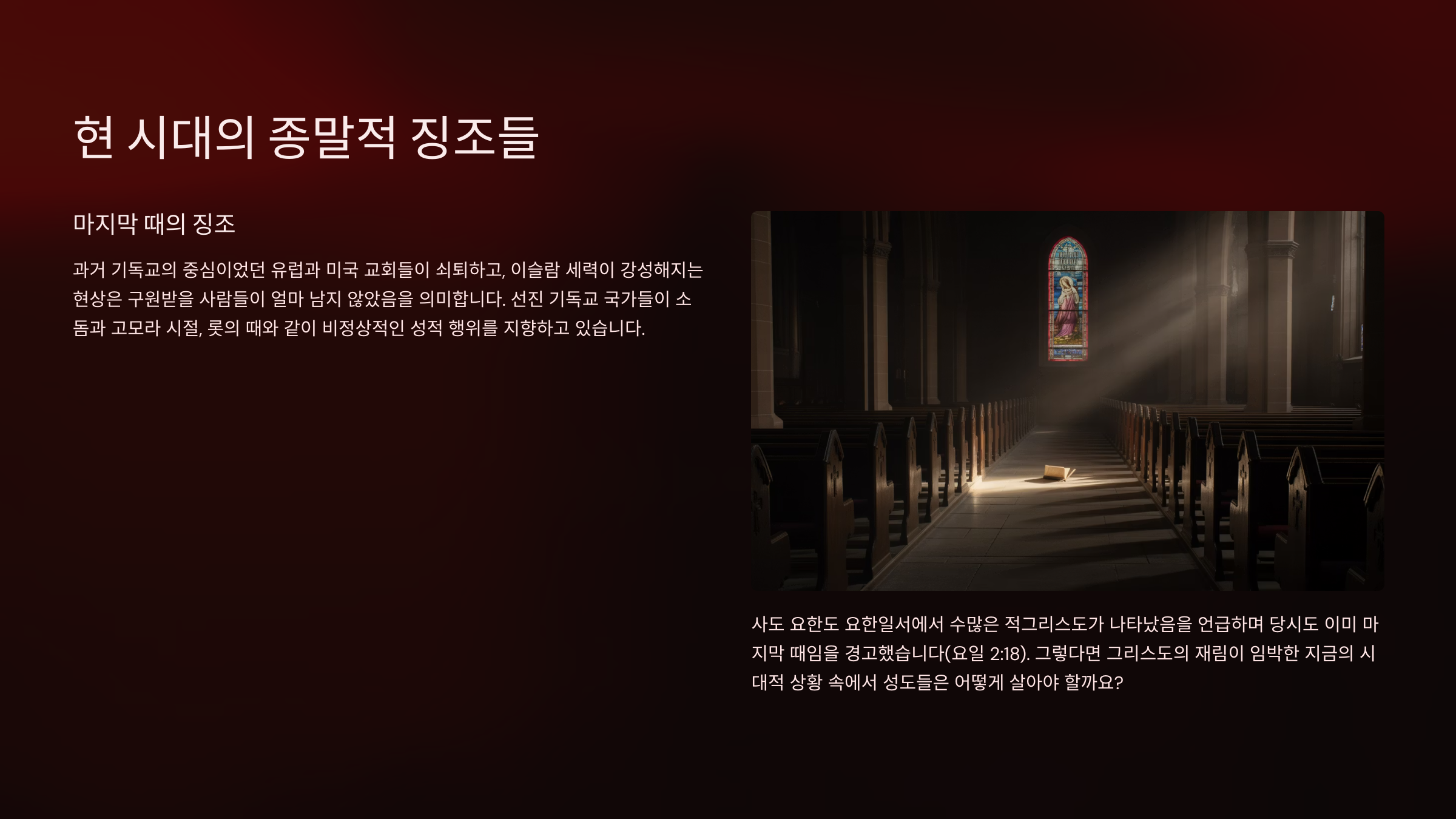 지금 우리가 살고 있는 이 시대는 어느 시대인가? 바울이 로마서를 쓸 당시에도 그느 자신이 마지막 때를 살고 있다고 생각했다(롬13:11~12). 바울은 예수 그리스도의 재림이 임박했다고 믿었지만 우리가 아는 바와 같이 바울의 시대에 예수께서 오시지 않았다. 이는 하나님께서 한 영혼이라도 더 구원하시기 위해 재림의 시기를 늦추셨기 때문이다(딤전2:4, 벧후3:9). 그렇지만 현재 우리가 사는 이 시대는 마지막 때의 징조가 뚜렷하게 나타나고 있다. 과거 기독교의 중심이었던 유럽과 미국 교회들이 모두가 다 쇠퇴하고, 대신 이슬람 세력이 강성해지는 현상은 이제는 더이상 구원받을 사람들이 얼마나 남아있지 않다는 것을 의미한다. 그리고 선진 기독교국가들이 저마다 소돔과 고모라 시절, 롯의 때와 같이 비정상적인 성적인 행위를 지향하고 있다. 사도 요한 또한 요한일서에서 수많은 적그리스도가 나타났음을 언급하면서 당시도 이미 마지막 때인 것을 경고했다(요일2:18). 그렇다면 그리스도의 재림이 임박한 지금의 시대적 상황 속에서 성도들은 과연 어떻게 살아야 맞는가?