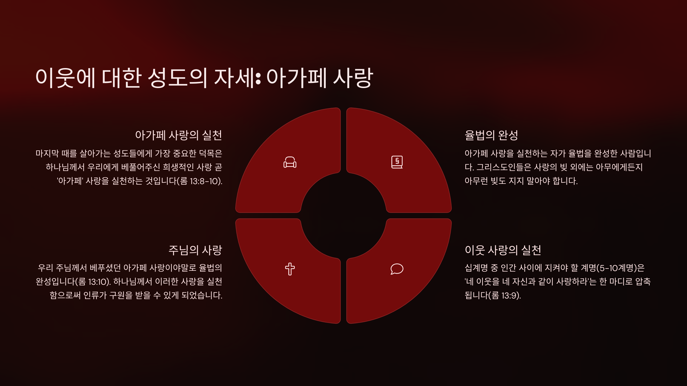 마지막 때를 살아가는 성도들에게 가장 중요한 덕목이 한 가지를 고르라면 그것은 무엇인가? 그것은 바로 하나님께서 우리에게 베풀어주신 희생적인 사랑 곧 '아가페'사랑을 실천하는 것이다(롬13:8~10). 왜냐하면 아가페 사랑을 실천하고 있는 자가 율법을 완성한 채 있는 사람이기 때문이다(롬13:8). 그러니까 그리스도인들은 사랑의 빛 외에는 아무에게든지 아무런 빚도 지지 말아야 한다. 남을 사랑함으로써 그리스도의 사랑을 실천해야 한다. 왜냐하면 하나님께서 이러한 사랑을 실천함으로써 인류가 구원을 받을 수 있게 되었던 것처럼, 우리도 하나님으로부터 말할 수 없는 사랑을 받았으니 그 사랑을 나누어주며 살아야 하는 것이다. 구약의 십계명 주에서 인간 사이에 지켜야 할 계명 곧 5~10계명을 가리켜 우리는 '인간계명'이라고 부른다. 그런데 이러한 인간계명을 한 마디로 압축하면 그것은 바로 '네 이웃을 네 자신과 같이 사랑하라'는 것이라고 했다(롬13:9). 또한 십계명 중에 하나님께 지켜야 할 계명 4가지를 요약하면 하나님을 사랑하라는 것이다. 고로  인간계명 6가지도 요약한다면 그것은 이웃사랑을 실천하는 것이라고 할 수 있다. 왜냐하면 이웃을 사랑한다면, 그는 간음하지도 않을 것이며, 살인하지도 않을 것이며, 도둑질도 하지 않을 것이기 때문이요 그리고 남의 것을 탐내지도 아니할 것이기 때문이다(롬13:9). 그러므로 우리 주님께서 베푸셨던 아가페 사랑이야말로 율법의 완성이라고 말할 수 있는 것이다(롬13:10).