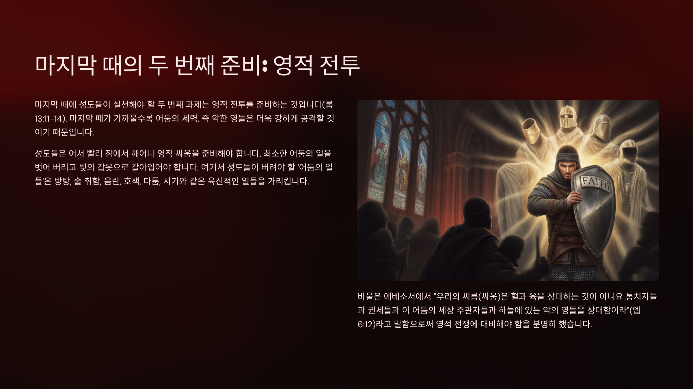 고로 이 마지막 때에 성도들이 실천해야 할 2가지 과제가 있다면 먼저는 영혼을 사랑하는 일이라고 할 수 있다(롬13:8~10). 그리고 두번째의 것은 뭐니뭐니해도 영적인 전투를 하는 것이라고 할 수 있다(롬13:11~14). 왜냐하면 마지막 때가 가까울수록 어둠의 세력, 즉 악한 영들은 더욱 더 강하게 공격할 것이기 때문이다. 따라서 지금 성도들은 어서 빨리 잠에서 깨어나 영적 싸움을 준비해야 한다. 최소한 어둠의 일을 벗어 버려야 한다. 그리고 빛의 갑옷으로 갈아 입어야 한다. 여기서 성도들이 버려야 할 '어둠의 일들'은 방탕, 술 취함, 음란, 호색, 다툼, 시기와 같은 육신적인 일들을 가리킨다. 성도는 최소한 이러한 죄악들을 멀리하고 그리스도의 레마 말씀으로 무장해야 한다.