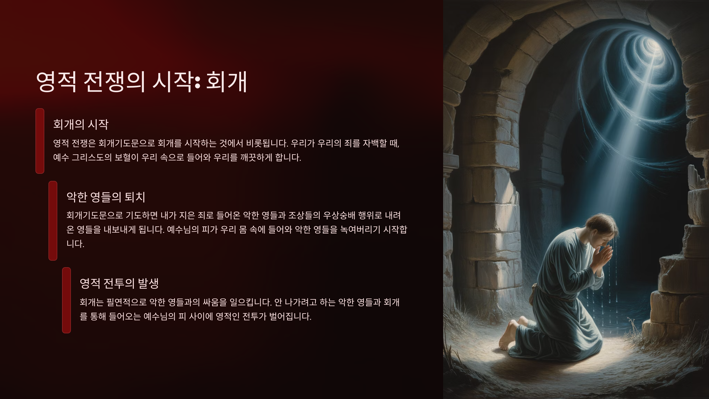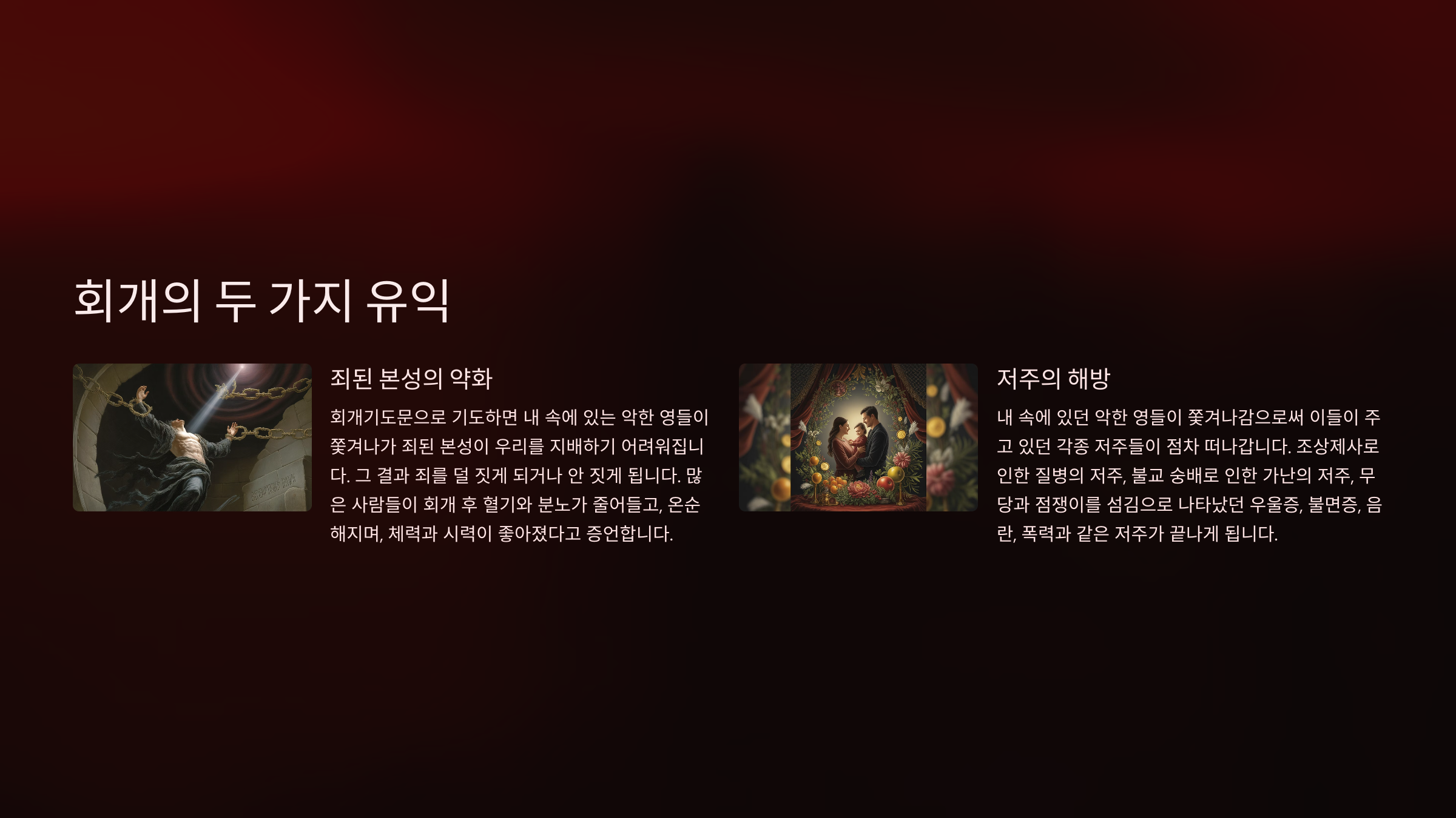 그러므로 거듭난 성도들이 회개기도문을 가지고 기도하기 시작하면 최소한 2가지 영적인 유익이 생긴다. 첫째는 내 속에 있는 영들이 쫓겨나가기 때문에 죄된 본성이 우리를 지배하기 어려워지게 된다는 것이다. 그러면 죄를 덜 짓게 되는 것이다. 아니 죄를 안 짓게 되는 것이다. 그러므로 회개기도문으로 기도하신 분들이 이구동성으로 말하는 것은 어느순간부터 혈기와 분노가 거의 나지 않는다는 것이다. 온순해지고 차분해졌다는 것이다. 그리고 체력이 좋아졌다고 말하기도 하고 시력이 좋아졌다고 말하기도 한다. 왜냐하면 내게 머물러 있던 영들이 떠나가기 때문이다. 둘째는 내 속에 있던 영들이 쫓겨나감으로 인하여 이것들이 주고 있던 각종 저주들이 점차로 떠나가게 된다는 것이다. 조상제사를 드려서 나타났던 질병의 저주가 떠나가고, 부처불교를 섬김으로 찾아온 가난의 저주가 떠나가는 것이다. 그리고 무당 점쟁이를 섬김으로 나타났던 우울증과 불면증, 음란과 폭력과 일찍 죽는 저주가 끝나는 것이다. 그리고 자식의 장래가 밝아지고 앞길이 열리는 것이다. 그러므로 회개는 해도 되 아니 해도 되는 것이 아니다. 회개를 하게 되면 최소한 죄를 덜 짓거나 안 짓는 사람이 되는 것이고, 내게 머물러 있던 저주들이 떠나가기 때문이다. 하지만 회개는 내 속에 있었으나 떠나가지 않으려면 그 악한 영들과 필연적으로 전쟁을 해야 하는 것이다. 그러므로 내 인생에 진정한 영적 전투는 회개가 있다는 것을 알고 지금부터라도 회개를 시작하기를 간절히 바란다.