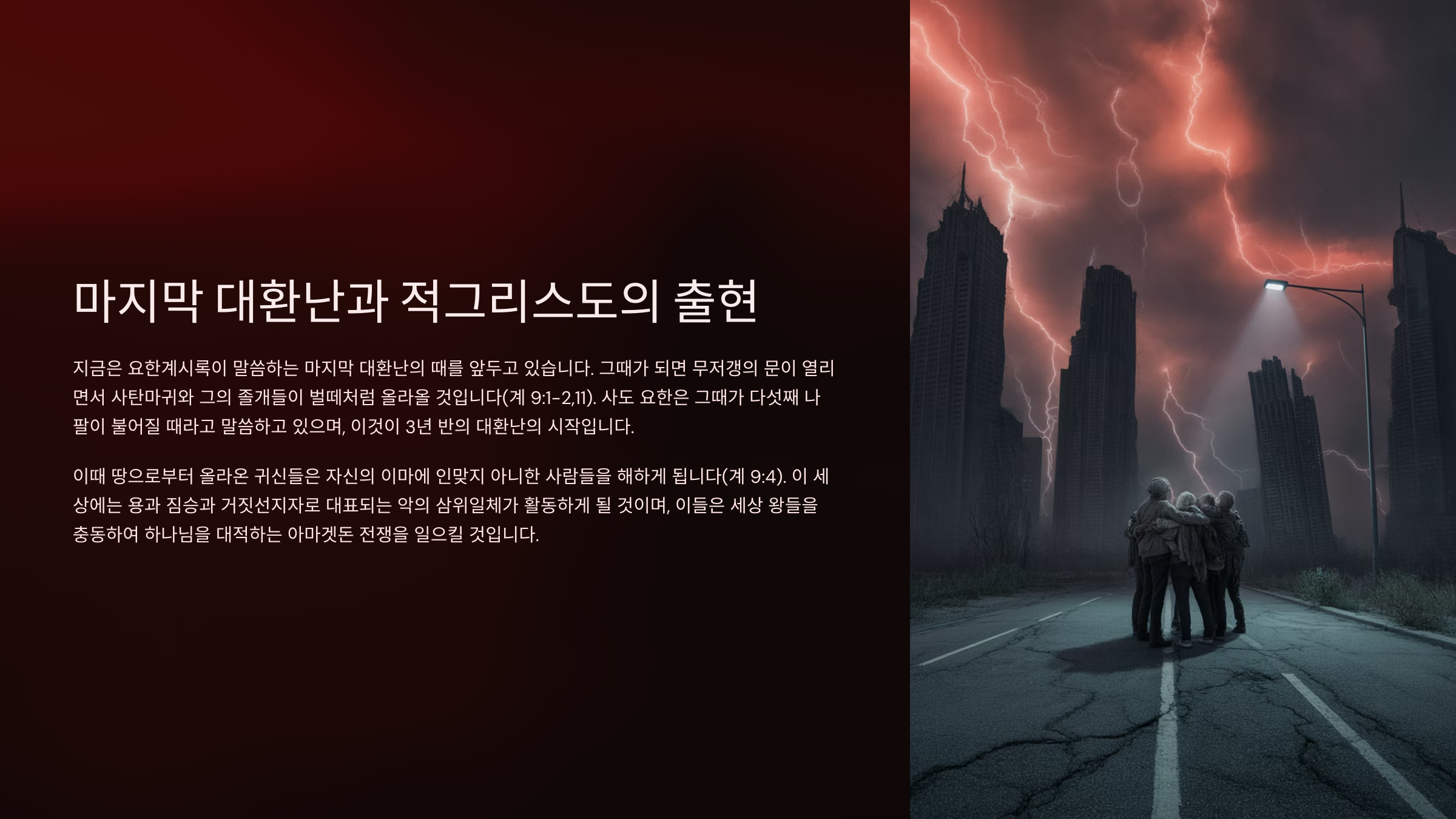 지금은 요한계시록이 말씀하고 있는 바, 마지막 대환난의 때를 앞두고 있는 때이다. 그때가 되면 무저갱의 문이 열리면서 사탄마귀와 그의 졸개들이 벌떼처럼 올라올 것이다(계9:1~2,11). 사도 요한은 그때가 바로 다섯째 나팔이 불어질 때라고 말씀하고 있다. 이것이 바로 ㅎ루3년반의 대환난의 시작이다. 이때 땅으로부터 올라온 귀신들이 누구를 해치는지 아는가? 자신의 이마에 인맞지 아니한 사람들을 해한다고 했다(계9:4). 그러나 그것은 오래가지는 않을 것이다. 그것이 대환난의 서곡을 알리는 싸인이기 때문이다. 그러나 이로 인하여 이제 이 세상에는 악의 삼위일체라 활동하는 세상이 될 것이다. 그래서 이들 곧 용과 짐승과 거짓선지자가 세상 왕들을 충동하여 하늘의 하나님을 대적하는 전쟁을 일으킬 것이다. 그것이 바로 인류 최후의 전쟁인 아마겟돈 전쟁이다. 그리고 이때 두 증인이 활동하여 유대인들 중의 남은 자를 구원할 것이다. 그리고 이방인들의 숫자가 채워지는 환난의 어느날에 주님께서 공중으로 오셔서 알곡성도들을 데려갈 것이다. 그리고