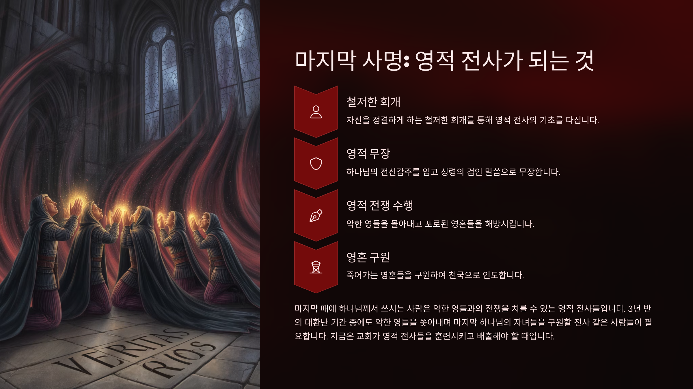 고로 말세지말을 살아가고 있는 우리 성도들에게 가장 필요하면서 또한 중요한 일은 무엇인가? 그것은 악한 영들과 싸울 수 있는 영적 전사를 배출하는 일이다. 그렇다. 이 시대에 주어진 마지막 사명은 영적 전사가 되는 것이다. 조금 전에도 언급했지만 마지막 때에는 수많은 귀신들이 세상에 올라와 사람들을 미혹할 것이고고, 특히 예수 믿는 자들을 핍박하며 죽이게 될 것이기 때문이다. 그때 악한 영들을 물리치고 악한 영들에게 포로로 잡혀있는 자들을 구출하려면 영적 전사가 되어야 한다. 그리고 영적 전쟁을 치를 영적 무기들을 장착하고 있어야 한다.  따라서 지금은 그 어느 때보다 영적으로 깨어 있어야 할 시기다. 하나님의 레마 말씀인 성령의 검으로 무장해야 하는 시기인 것이다. 특히 예수께서 공생애를 시작하실 때에 가장 먼저 행하신 일의 하나가 바로 귀신을 쫓아내는 것이었고, 당신의 제자들에게도 동일한 권능을 부여하여 파송하셨다는 것을 기억해야 한다. 그리고 믿는 자들에게는 귀신을 쫓아내고 병든 자를 고치는 능력이 따를 것이라고 약속하셨음도 잊지 말아야 한다. 그러므로 우리는 이제 개인의 신앙을 지키는 선을 넘어, 영적 전쟁의 최전선에 서는 영적 전사로 거듭나야 하는 것이다. 철저한 회개를 통해 자신을 정결하게 하고, 하나님의 전신갑주를 입어 악한 영들을 몰아내며, 죽어가는 영혼들을 구원하여 천국으로 인도하는 자가 되어야 하는 것이다.