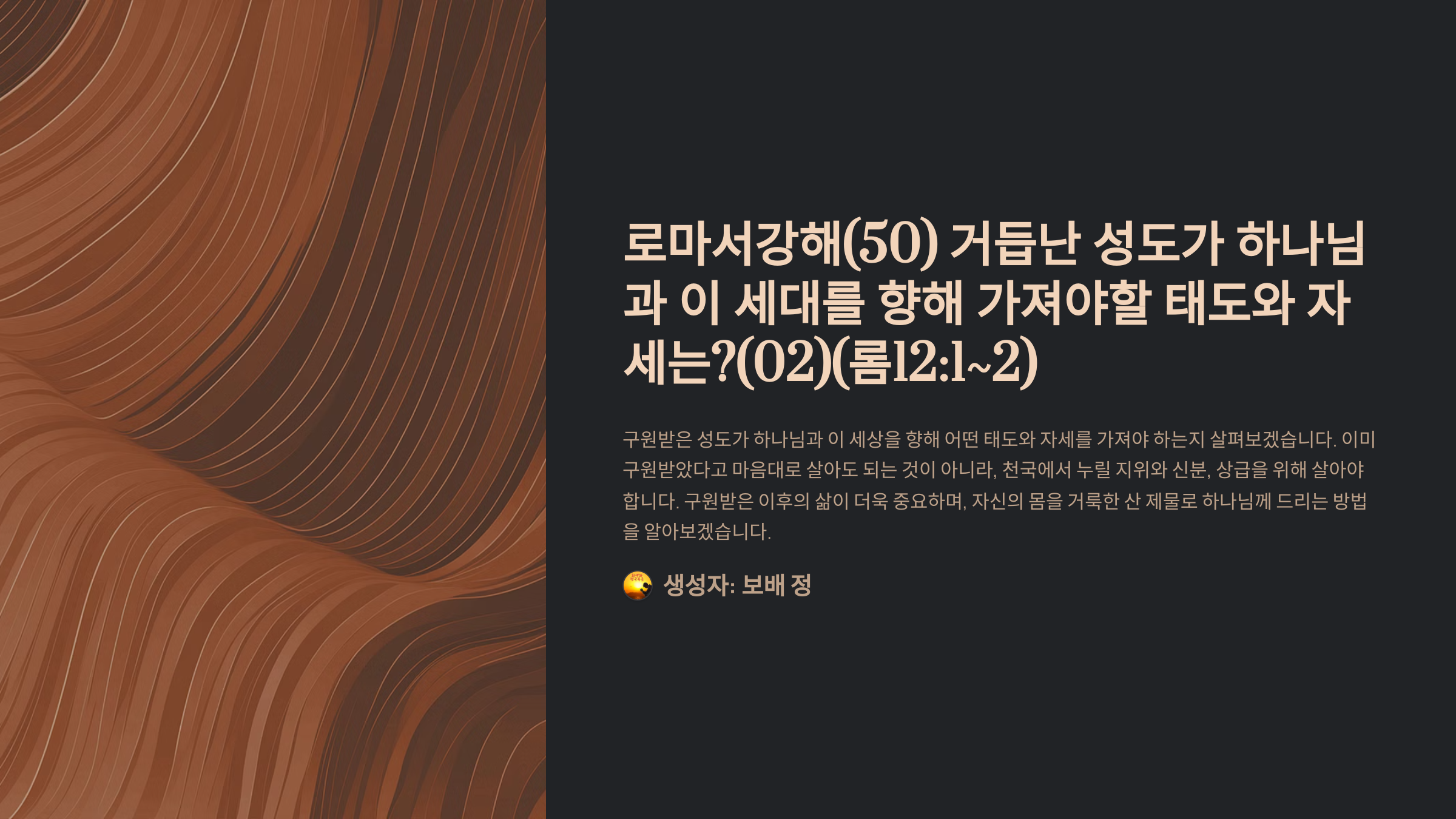 제목: [로마서강해(50)] 거듭난 성도가 하나님과 이 세대를 향해 가져야할 태도와 자세는?(02)(롬12:1~2)_2025-06-25(수)