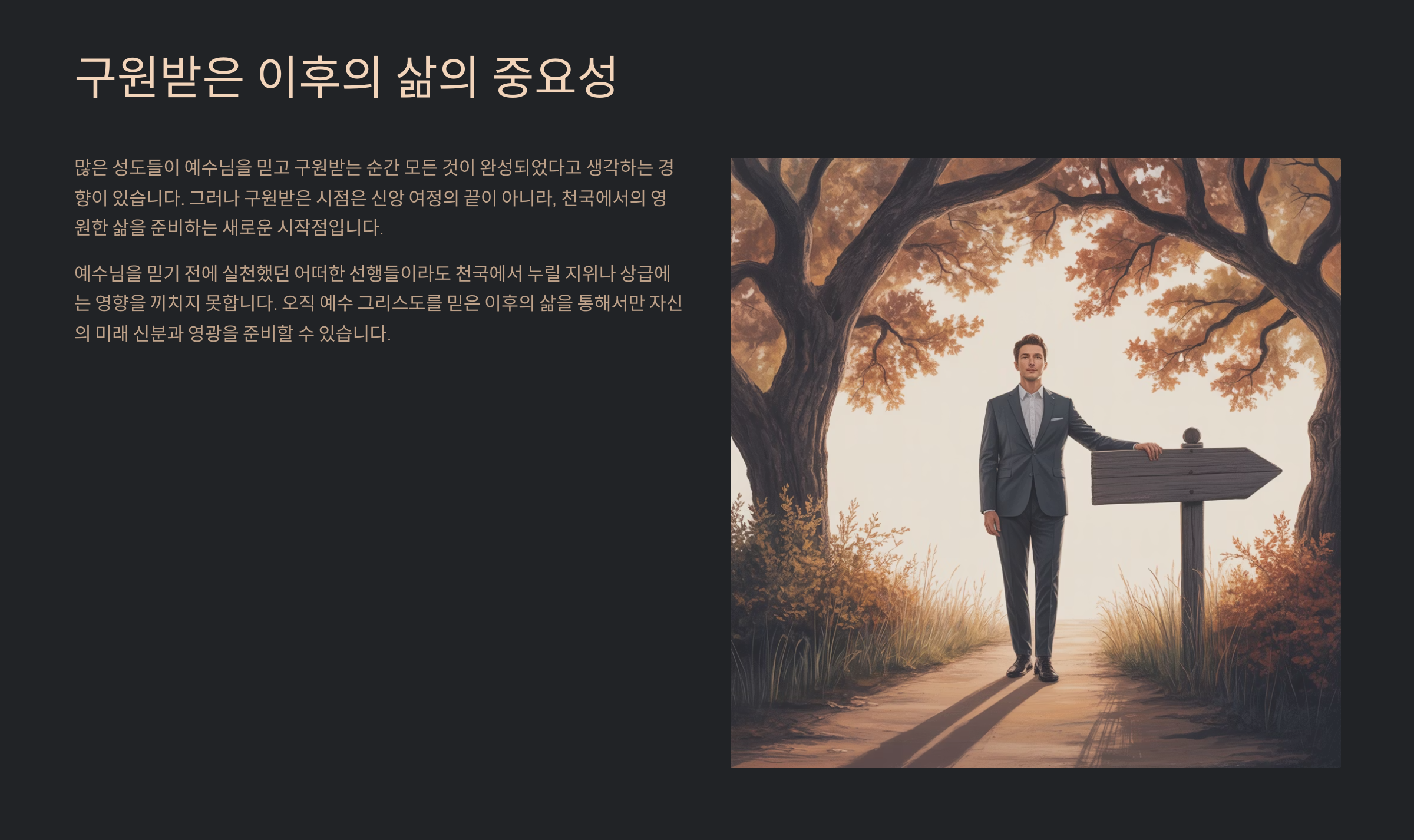많은 성도들이 예수님을 믿고 구원받는 순간, 모든 것이 완성되었다고 생각하는 경향이 있다. 그러나 자신이 구원받은 시점은 신앙 여정의 끝이 아니라, 천국에서의 영원한 삶을 준비하는 새로운 시작점에 불과한 것이다. 왜냐하면 성도들이 예수님을 믿기 전에 실천했던 어떠한 선행들이라고 할지라도 천국에서 누릴 자신의 지위나 상급에는 어떤 영향도 끼치지 못하기 때문이다. 그것은 오직 예수 그리스도를 믿은 이후의 삶을 통해서만 자신의 미래 신분과 영광을 준비할 수 있는 것이다. 이 세상에 살다가 천국에 들어갔던 어떤 성도들도 구원받은 이후의 삶이 아닌 이전의 삶을 통해 자신의 미래를 준비한 사람은 하나도 없다. 모두가 다 구원받은 이후 자신의 삶을 통해서 천국을 준비한 것이다. 그러한 예로서 위대한 신약의 사도인 사도 바울도 역시 마찬가지였다. 그는 구원받은 이후 자신의 삶을 어떻게 살아야 값지게 사는지를 정녕 깨닫게 된다. 그리하여 그는 심지어 결혼도 하지 않은 채 자신에게 주어진 하나님의 뜻을 실천하는 데에 일생을 바친다. 그러므로 그가 현재 천국에서 누리고 있는 지위와 신분 그리고 상급은 간신히 턱걸이로 구원받은 한 편 강도와는 비교할 수가 없다. 그러므로 내가 이제 구원받은 성도라고 한다면 정신 차릴 때가 돌아온 것이다.