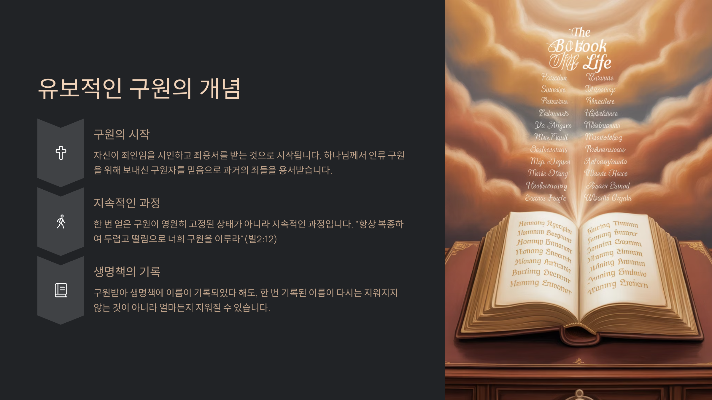 고로 내가 예수님을 믿어서 구원을 받았다고 해서 구원받은 이후의 삶을 함부로 살아서는 아니 된다. 이는 내가 구원받아서 생명책에 나의 이름이 이미 기록된 채 있다 할지라도, 한 번 기록된 나의 이름이 다시는 생명책에서 지워지지 않는 것이 아니라 얼마든지 지워질 수가 있기 때문이다. 그러므로 구원받은 성도들은 자신의 이름이 생명책에 어떻게 기록된 채 있는지를 점검하여, 막연한 신앙생활에서 속히 벗어나야 한다. 그리고 장차 천국에 들어가서 누리게 될 지위와 신분 그리고 천국집을 잘 준비해야 한다. 사도 바울도 다메섹 도상에서 예수님을 만난 이후, 이전의 모든 것을 다 배설물로 여기고 천국에서의 삶을 준비하는 데 전념을 하게 된다. 마찬가지로 우리도 역시 구원받은 이후의 삶을 잘 준비해야 하는 것이다.