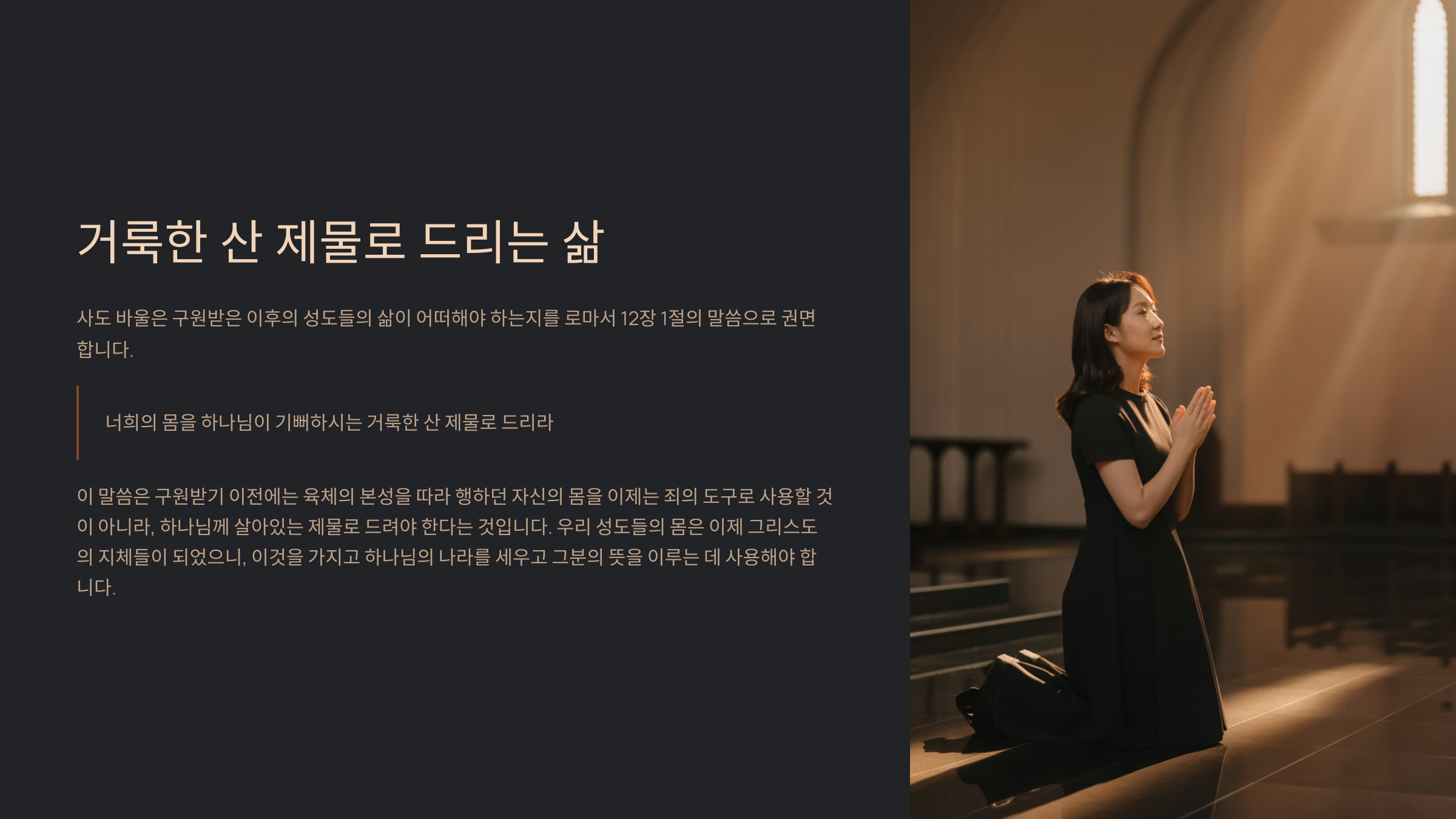 사도 바울은 구원받은 이후의 성도들의 삶이 어떠해야 하는지를 로마서 12장 1절의 말씀으로 권면한다. 그것은 “너희의 몸을 하나님이 기뻐하시는 거룩한 산 제물로 드리라”는 것이었다. 이 말씀은 구원받기 이전에는 육체의 본성을 따라 행하던 자신의 몸은 이제는 죄의 도구로 사용할 것이 아니라, 하나님께 살아있는 제물로 드려야 한다는 것이다. 이는 구약시대에 성도들이 죄를 지었으면 흠없는 제물을 하나님께 바쳤던 것처럼, 이제는 예수께서 피값을 주고 산 자신의 몸을 하나님께서 살아있는 제물로 드려야 한다는 뜻이다. 이것은 자신의 육체를 더러운 본성을 따라 행하는데 사용하지 말고, 자신의 몸을 주와 복음을 위하여 의의 병기로 하나님께 드리는 것이다. 사실 우리 성도들의 몸은 이제는 그리스도의 지체들이 되었으니, 이것을 가지고 하나님의 나라를 세우고 그분의 뜻을 이루는 데 사용해야 하는 것이다. 그래야 비로소 우리 성도들도 천국에서 누릴 아름다운 지위와 신분을 소유할 수 있으며, 천국에서 누릴 상급으로서 아름다운 처소를 예비할 수 있기 때문이다.