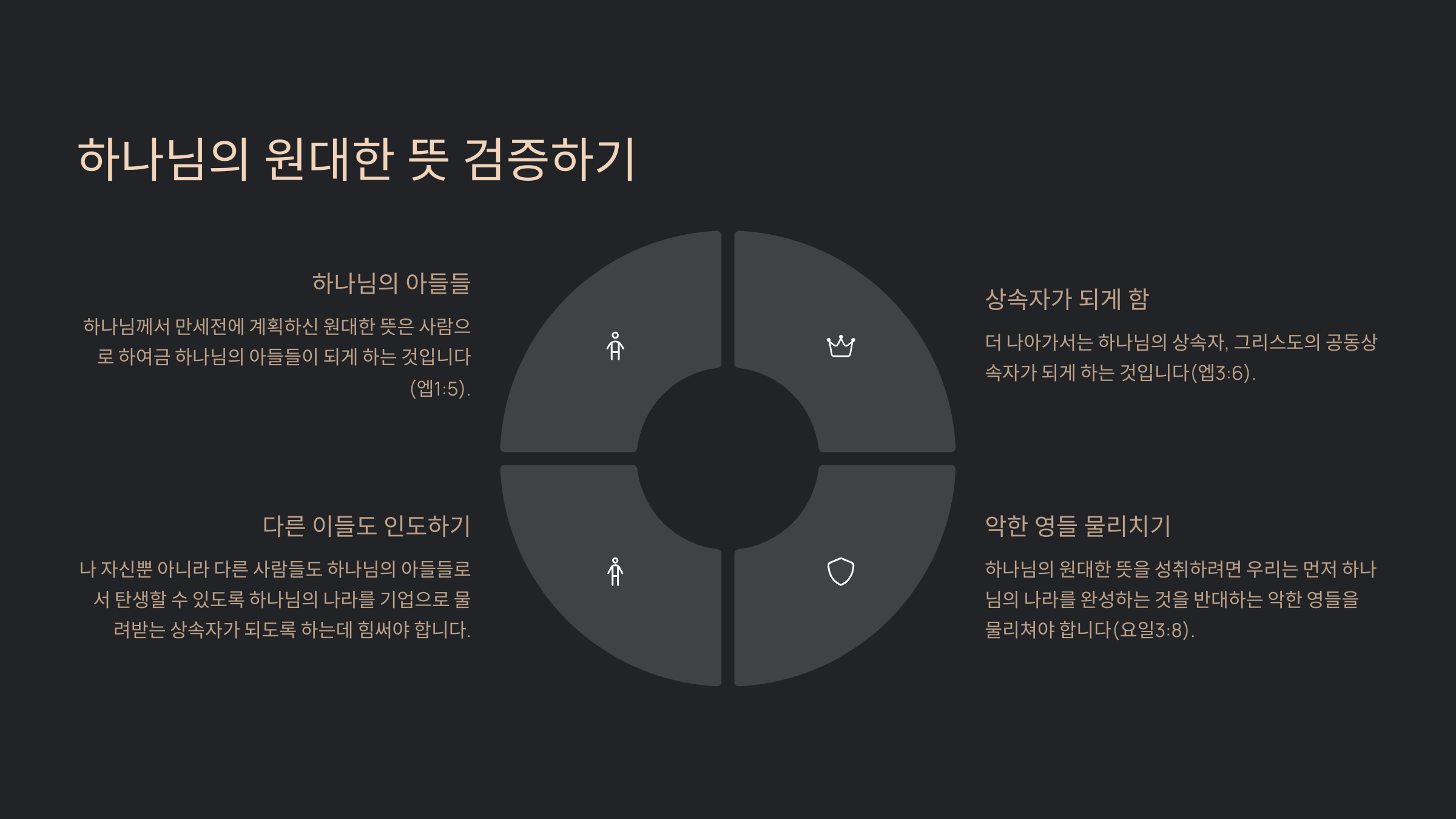 그렇다면 하나님께서 만세전에 계획하신 원대한 하나님의 뜻이란 대체 무엇인가? 그것은 사람으로 하여금 하나님의 아들들이 되게 하는 것이고 더 나아가서는 하나님의 상속자 곧 그리스도의 공동상속자가 되게 하는 것이다(엡1:5, 3:6). 그러나 이러한 하나님의 뜻이 성취되는 것을 계속해서 방해하는 세력들이 있으니 그들은 바로 사탄마귀와 그의 졸개들이다. 그러므로 하나님의 원대한 뜻을 성취하려면 우리는 먼저 우리가 하나님의 나라를 완성하는 것을 반대하는 악한 영들을 물리쳐야 한다(요일3:8). 그리고 나 자신 뿐 아니라 다른 사람들도 하나님의 아들들로서 탄생할 수 있도록 그리고 하나님의 나라를 기업으로 물려받는 상속자가 되도록 하는데 힘써야 한다. 이것을 위하여 나 자신을 의의 병기로 날마다 하나님께 드려야 하는 것이다.