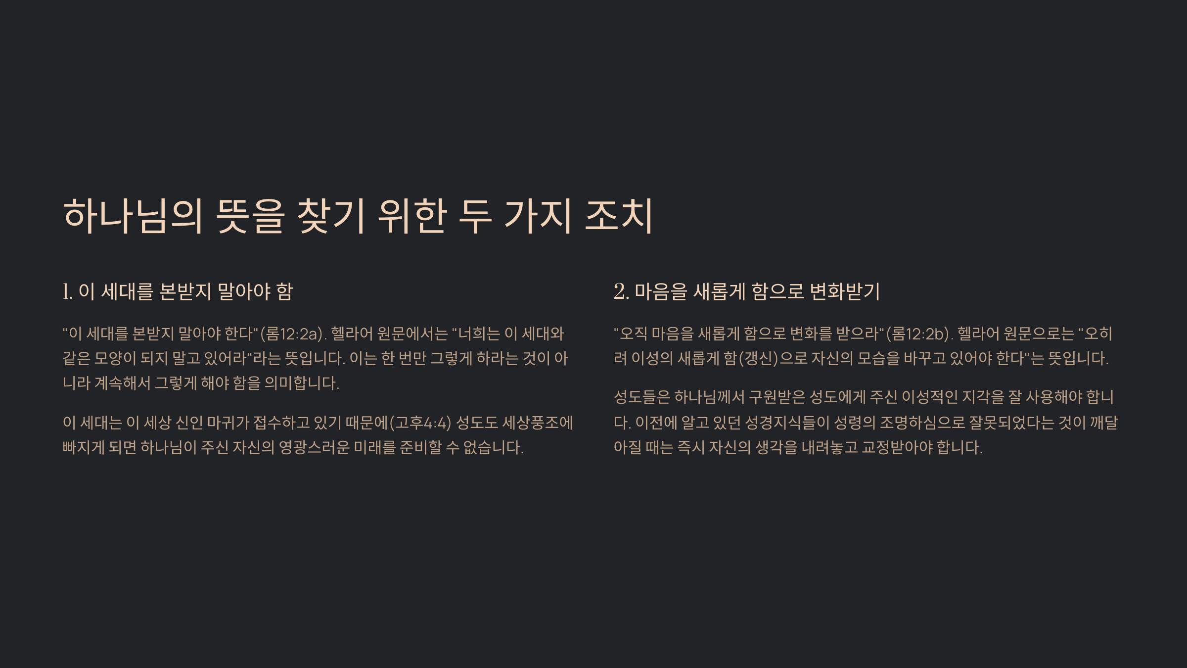 이미 구원받은 성도가 하나님과 이 세상을 향해 어떤 태도와 자세를 가져야 하는가? 이미 구원받았으니 이제는 마음대로 살아도 되는 것인가? 그렇지 않다. 왜냐하면 회개와 믿음을 통하여 구원받았으니, 그때부터는 천국에서 들어갔을 때 누리게 될 지위와 신분 그리고 상급을 위해서 살아야 하기 때문이다. 그러므로 어쩌면 구원받은 이후의 삶이 더 중요한지도 모른다. 왜냐하면 이미 구원을 받았다고 할지라도 구원을 잃어버릴 수도 있으며, 구원받은 이후에 삶이 자신의 미래를 결정해주기 때문이다. 그러므로 성도들은 구원받은 이후의 삶을 잘 준비해야 한다. 이를 위해서는 자신의 몸을 거룩한 산 제물로 하나님께 드릴 수 있어야 한다. 그러려면 나 자신을 향한 하나님의 원대한 뜻이 무엇인지를 분별할 수 있어야 한다. 그리고 이것을 위해 2가지를 실천해야 한다. 그래서 이번 시간에는 구원받은 성도가 자신의 몸을 하나님께 드리기 위해 과연 하나님의 뜻을 어떻게 깨달을 수 있으며 또한 그것을 실천하기 위해 필요한 2가지 방법이 무엇인지를 살펴보고자 한다.