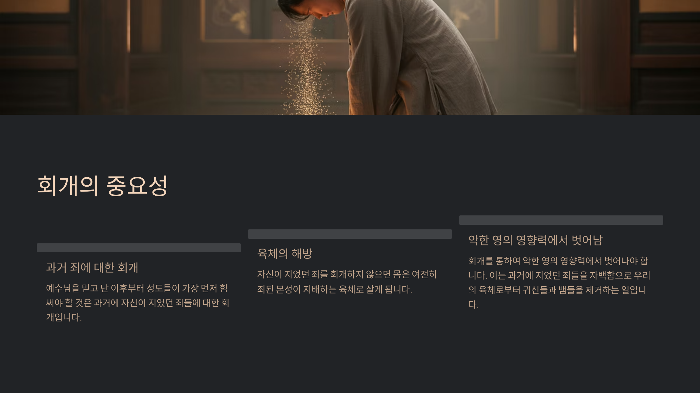 그런데 이 모든 영적 원리를 삶으로 살아내기 위해 가장 필요한 것이 하나 있다. 그런데 안타깝게도그것을 로마서에서는 언급하지 않는다. 그럼, 그것은 무엇인가? 그것은 예수님을 믿고 난 이후부터 성도들이 가장 먼저 힘써야 할 것인데, 그것은 바로 회개하는 일이다. 왜냐하면 그것도 과거에 자신이 지었던 죄들에 대한 회개다. 만약 자신이 지었던 죄를 회개하지 않았다면 그의 몸은 여전히 죄된 본성이 지배하는 육체로 살고 있을 것이기 때문이다. 또한 하나님께서 의의 병기로 드려야할 우리의 몸을 여전히 죄를 짓는 도구로 사용하고 있는 것 뿐이기 때문이다. 사실 우리 몸 속에는 우리가 예수님을 믿기 전에 이미 모태로부터 악한 영들이 치고 들어와 거주하고 있다. 그러므로 그것들은 우리의 일생을 힘들게 한다. 그것들은 우리가 예수님을 믿는 성도가 되었다고 할지라도 여전히 우리 육체 속에 들어있어서 질병과 가난 ,신기와 막힘의 저주를 안겨주기 때문이다. 그러므로 우리는 반드시 회개를 통하여 악한 영의 영향력에서 벗어나야 한다. 그것은 과거에 지었던 죄들을 자백함으로 우리의 육체로부터 귀신들과 뱀들을 제거하는 일이다. 그런 다음 우리는 우리의 몸을 의의 병기로 하나님께 드려야 하는 것이다. 우리의 몸을 하나님의 원대한 뜻을 이루는데 사용하는 것이다.