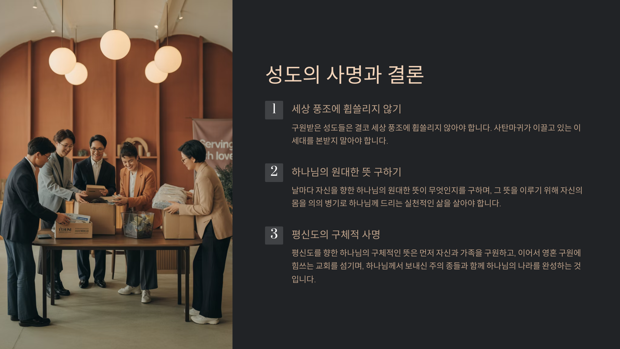내가 만약 구원받은 성도라면 자신에게 주어진 현실에 안주해서는 아니 된다. 날마다 나 자신을 성찰하고 하나님의 원대한 뜻이 무엇인지를 철저히 검증한 다음 그것을 실천해야 하기 때문이다. 이를 위해서 먼저는 사탄마귀가 이끌고 있는 이 세대를 본받지 말아야 한다. 그리고 날마다 이성의 갱신을 통해 잘못 알고 있던 성경지식들과 교리들을 교정해야 한다. 그래서 성령께서 이끄시는 곳을 향하여야 한다. 참고로, 평신도를 향한 하나님의 구체적인 뜻은, 먼저는 자신과 가족을 구원하고, 이어서는 영혼 구원에 힘쓰는 교회를 섬기는 것이다. 그리고 하나님께서 보내신 주의 종들과 함께 하나님의 나라를 완성하는 것이다. 입니다. 그렇다. 구원받은 성도들은 결코 세상 풍조에 휩쓸리지 않아야 한다. 그리고 날마다 자신을 향한 하나님의 원대한 뜻이 무엇인지를 구하며, 그 뜻을 이루기 위해 자신의 몸을 의의 병기로 하나님께 드리는 실천적인 삶을 살아야 하는 것이다. 그래서 이미 얻은 구원을 두렵고 떨리는 마음으로 이뤄가야 한다. 그래서 우리의 몸 전체를 하나님이 기뻐하시는 거룩한 산 제물로 주님께 드려야 한다. 이것이야말로 이 시대를 살아가는 우리 성도들에게 주어진 가장 중요하고도 영광스러운 하나님의 뜻이요 나의 사명인 것이다.