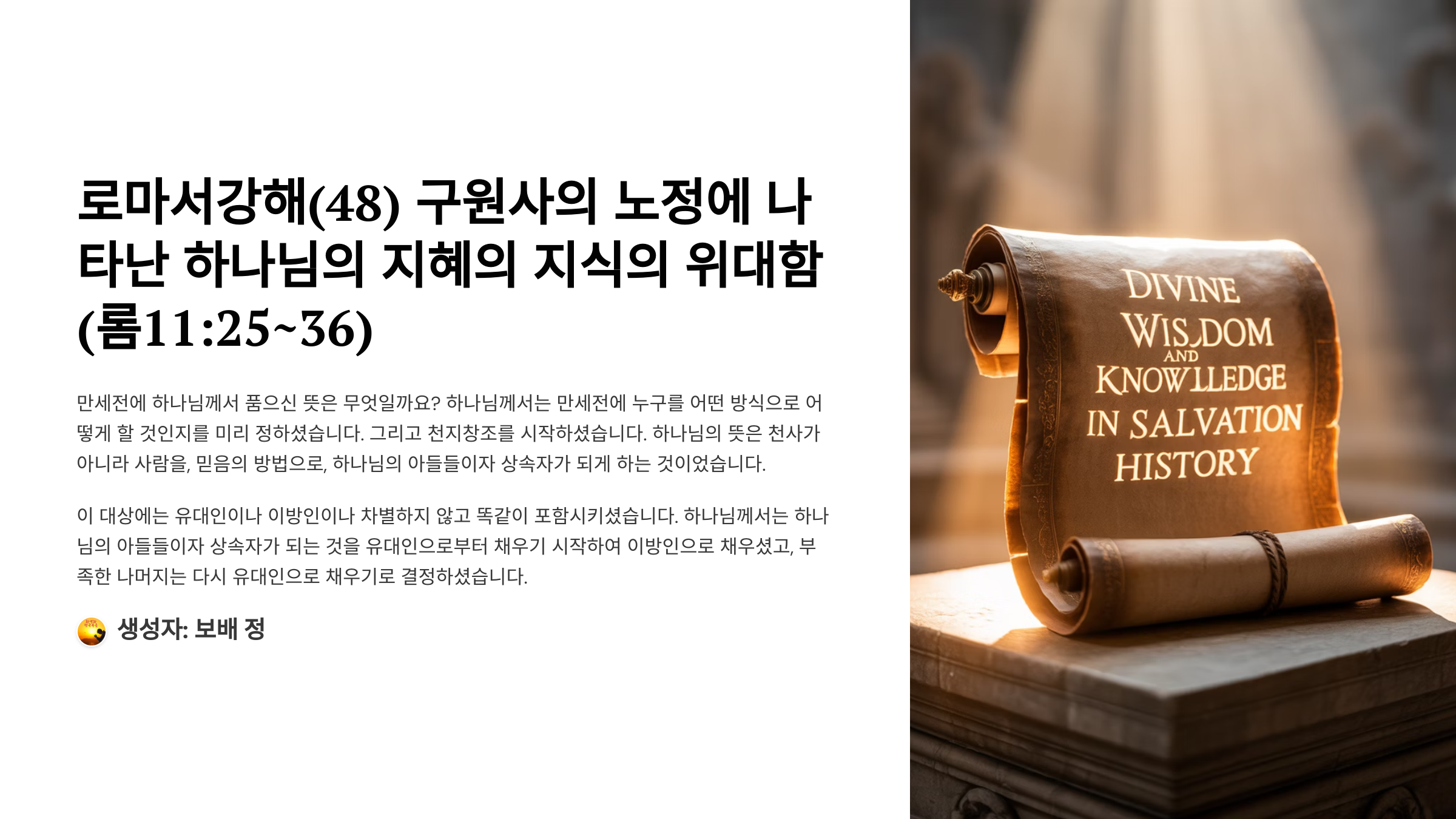 제목: [로마서강해(48)] 구원사의 노정에 나타난 하나님의 지혜의 지식의 위대함(롬11:25~36)_2025-06-23(월)