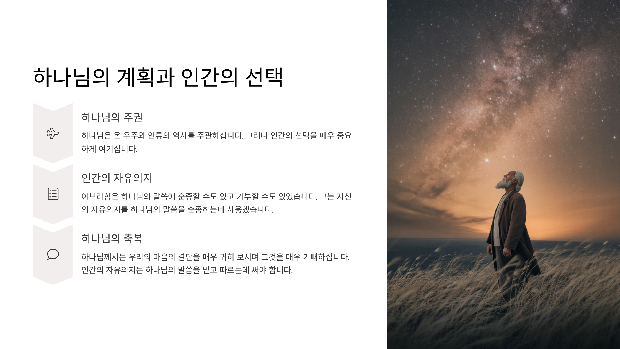 하나님은 온 우주와 인류의 역사를 주관하신다. 하지만 인간의 선택을 매우 중요하게 여기신다. 그것은 구약에 나타난 이스라엘의 구원역사를 보면 알 수가 있다.