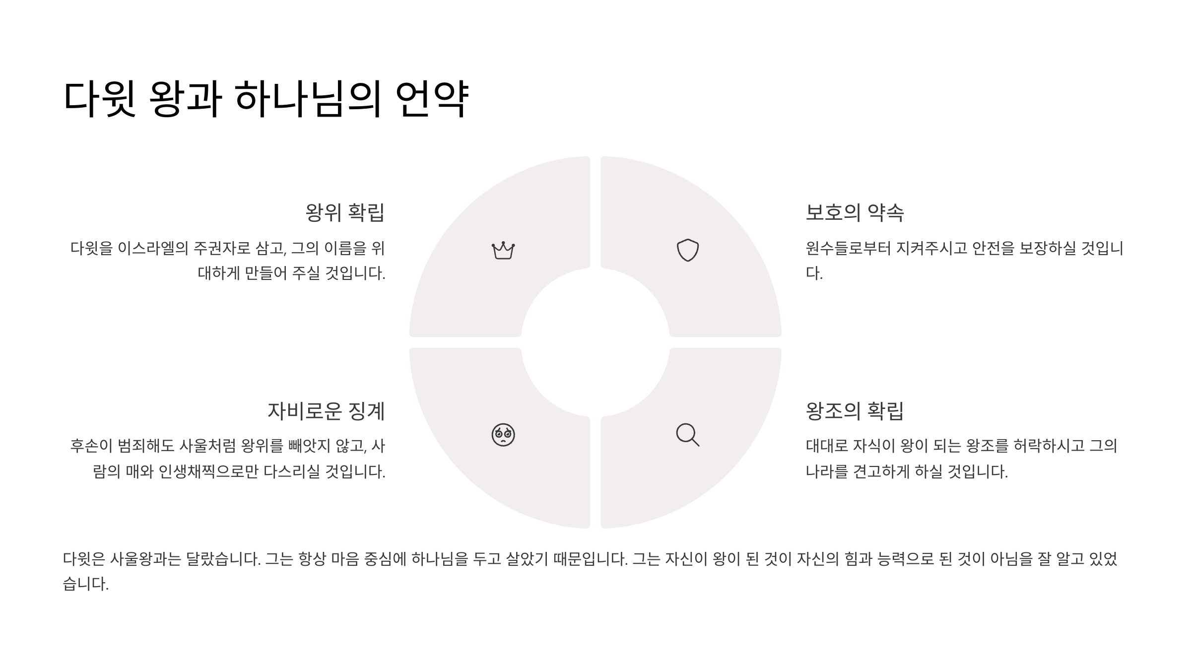 그런데 다윗은 사울왕과는 조금 달랐다. 높은 영의 나이를 가진 자로 보내어져서 그런지 모르겠지만, 그는 항상 마음 중심에 하나님을 두고 살았기 때문이다. 그는 무엇보다도 자신이 왕이 된 것은 결코 자신의 힘과 능력으로 된 것이 아니라는 것을 잘 알고 있었다. 그러므로 그가 주변나라를 다 정복하여 마침내 시온산성을 정복한 다음 곧바로 왕도를 헤브론에서 예루살렘을 옮긴다. 그리고 그때 가장 먼저 한 일은 그때까지 기럇여아림에 70년간 머물고 있던 법궤를 예루살렘으로 옮기는 일이었다(삼하6장). 그리고 얼마후 그는 생각했다. 자신은 백향목 궁에 거하는데 하나님의 궤를 펄럭이는 휘장 가운데 두는 것은 잘못된 것이라고 생각한다. 그래서 그는 하나님의 종 나단선지자를 찾아가 자신의 마음을 전한다. 그는 그가 하나님을 위해 그분의 집을 지어드리고 싶다고 한 것이다. 그러자 하나님께서 그 이야기를 들으시고는, 지금까지 당신은 광야에서 지어진 성막 안에 거하신 후 계속해서 장막과 성막 안에만 거해왔는데, 자기를 위해 집을 지어주겠다고 한 다윗에게 감동하시게 된다. 그러자 다윗에게 놀라운 축복을 약속하신다. 이것을 '다윗언약'이라고 부른다(삼하7장). 그것은 다윗을 이스라엘의 주권자로 삼을 것이고, 그의 이름을 위대하게 만들어 줄 것이며, 원수들로부터 지켜줄 것이며, 또한 그에게는 대대로 자식이 왕이 되는 왕조를 허락하실 뿐만 아니라 그의 나라를 견고하게 하실 것이라고 했다. 그리고 혹시 그의 후손이 범죄한다고 할지라도 사울왕에게서 왕위를 빼앗은 것 같지 아니하고, 사람의 매와 인생채찍으로만 다스실 정도만 하시겠다고 말씀하셨다. 그리하여 다윗을 왕으로 시작하여 다윗왕조가 탄생하였다. 그리고 다윗왕조는 그의 후손이 대대로 왕이 되어 무려 20대까지 왕위가 이어졌다.