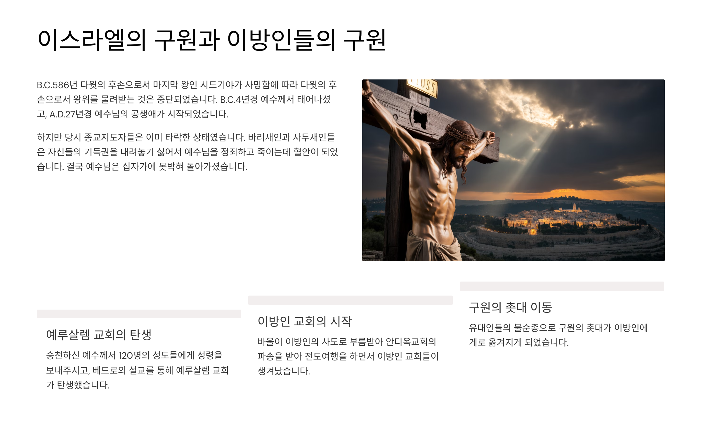 B.C.586년 다윗의 후손으로서 마지막 왕인 시드기야가 사망함에 따라 다윗의 후손으로서 왕위를 물려받는 것은 중단된다. 그리고 B.C.4년경 예수께서 태어나신다. 그리고 A.D.27년경 예수님의 공생애가 시작된다. 하지만 이미 종교지도자들을 타락할대로 타락해버린 상태였다. 당시 종교지도자의 두 그룹으로서 바리새인과 사두새인들은 하나님의 보내신 구원자를 보면서도 자기들이 가지고 있던 기득권을 내려놓기 싫어서 그만 예수님을 정죄하고 죽이는데 혈안이 된다. 결국 하나님께서 보내신 자 예수께서는 자기의 백성들에 의해 십자가에 못박혀 돌아가시게 된다. 그러나 승천하신 예수께서는 갈릴리에서 자신을 따르던 120명의 성도들에게 성령을 보내주시고, 이어서 방언을 듣고 찾아온 디아스포라 유대인들을 향해 선포한 베드로의 설교를 통해 변화된 헬라파 유대인들에 의해 예루살렘 교회가 탄생한다. 하지만 대부분의 유대인들은 예수님을 믿고 따르는 자들을 저주하며 나사렛 이단처럼 취급한다. 그리하여 주 예수께서는 주 예수님을 믿는 자들을 잡아 가두기 위해 다메섹으로 향하는 바울을 변화시켜 그를 이방인으로 사도로 삼으신다. 그리하여 최초의 이방인교회였던 안디옥교회의 파송을 받아 1차, 2차, 3차 전도여행을 하는데, 이때 이방인의 교회들이 생겨난다. 구원의 촛대가 이방인에게로 옮겨지게 된 것이다. 그러다가 유대인들에게 붙들려 죽임당할 위협에 처하자 자신이 가진 로마시민권을 발동하여 로마황제에게 재판을 받을 것을 청구한다. 그리하여 바울은 로마에 가서 감옥게 갇히게 되지만 아직 죄인이 아닌고로 자유가 주어져 서바나로 전도여행을 떠난다. 그리고 히브리서를 로마교회에 보낸다. 그리고 돌아와서 갇힌 후 네로황제의 명령에 따라 순교한다.