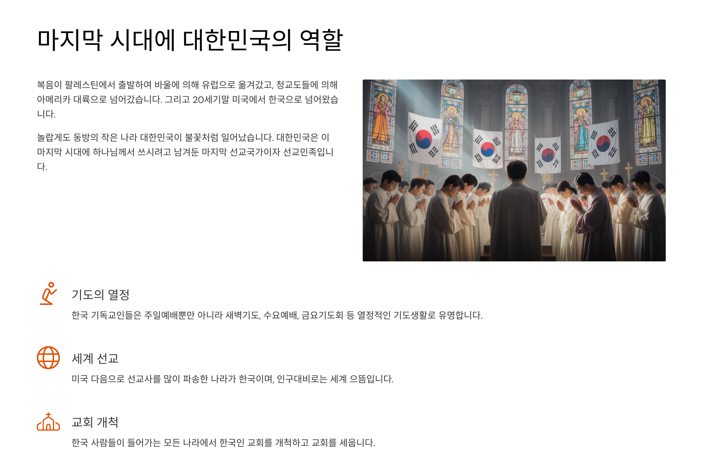 그렇다면 이 마지막 시기에 대한민국은 과연 어떤 역할을 할 것인가? 그것은 마지막 추수의 사명을 감당하는 일이다. 사실 복음이 팔레스틴에서 출발하여 바울에 의해 유럽으로 옮겨갔다. 그리고 청교도들에 의해 다시 복음은 아메리카 대륙으로 넘어갔다. 그리고 20세기말 다시 미국에서 한국으로 넘어왔다. 그런데 놀라운 일이 일어났다. 동방의 한 작은 나라 대한민국이 불꽃처럼 일어난 것이다. 대한민국은 이 마지막 시대에 하나님께서 쓰시려고 남겨둔 마지막 선교국가이자 선교민족이었기 때문이다. 왜냐하면 셈족의 후손들 가운데 지금의 이스라엘 사람들이 벨렉의 후손이라면, 대한민국 사람들은 욕단의 후손이기 때문이다(창10:25). 그러니까 한국은 숨겨놓은 셈족의 후예인 것이다. 그리하여 기독교는 한국으로 건너와서 마지막으로 꽃을 피우고 있다. 이때까지 기독교의 역사 가운데 회개의 비밀과 원죄의 비밀과 귀신과 뱀들의 비밀 그리고 저주의 비밀을 이렇게까지 풀어준 때가 없었다. 그리고 천국의 실상을 이렇게까지 많이 알려준 때가 없었다. 특히 천국에서 성도들이 얻게 될 지위와 신분 그리고 상급에 대해서는 익히 들어본 적이 없는 놀라운 말씀들이다. 그리고 한국사람들의 열정을 참으로 대단한 것이다. 한국 사람들은 단 하나의 나라 북한을 제외하고는 모든 나라에 들어가 있다. 그런데 한국사람들이 들어가는 모든 나라에서 한국사람을 교회을 개척하고 교회를 세운다. 그리고 한국사람들은 예배를 주일에 한 번 드리는 것으로 만족하지 않고, 기도회를 열어 날마다 기도하는데, 날마다 새벽기도를 하고 수요일와 금요일에는 저녁에 모여서 기도를 한다. 하나님께서 사랑하지 아니할 수가 없다. 그리고 미국 다음으로 선교사를 많이 파송한 나라가 한국이다. 그러나 인구대비로 보면 단연 세계 으뜸이다. 하지만 작금의 대한민국은 동성애를 인정하려고 하는 등의 위험한 상황에 놓여 있어서 안타까운 마음을 금할 수가 없다. 이는 이방인의 구원받을 수가 채워지는 종말의 시점이 가까왔음을 단적으로 보여주는 것이라고 하겠다. 그때가 다 된 것이다.