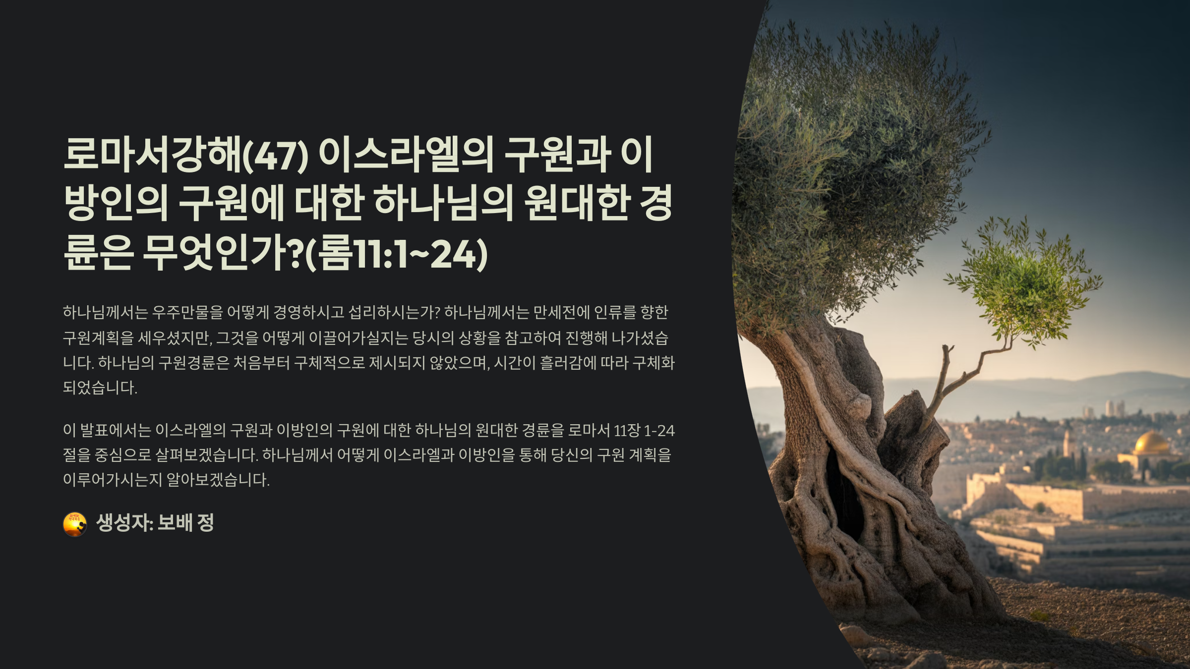 제목: [로마서강해(47)] 이스라엘의 구원과 이방인의 구원에 대한 하나님의 원대한 경륜은 무엇인가?(롬11:1~24)_동탄명성교회 정보배목사