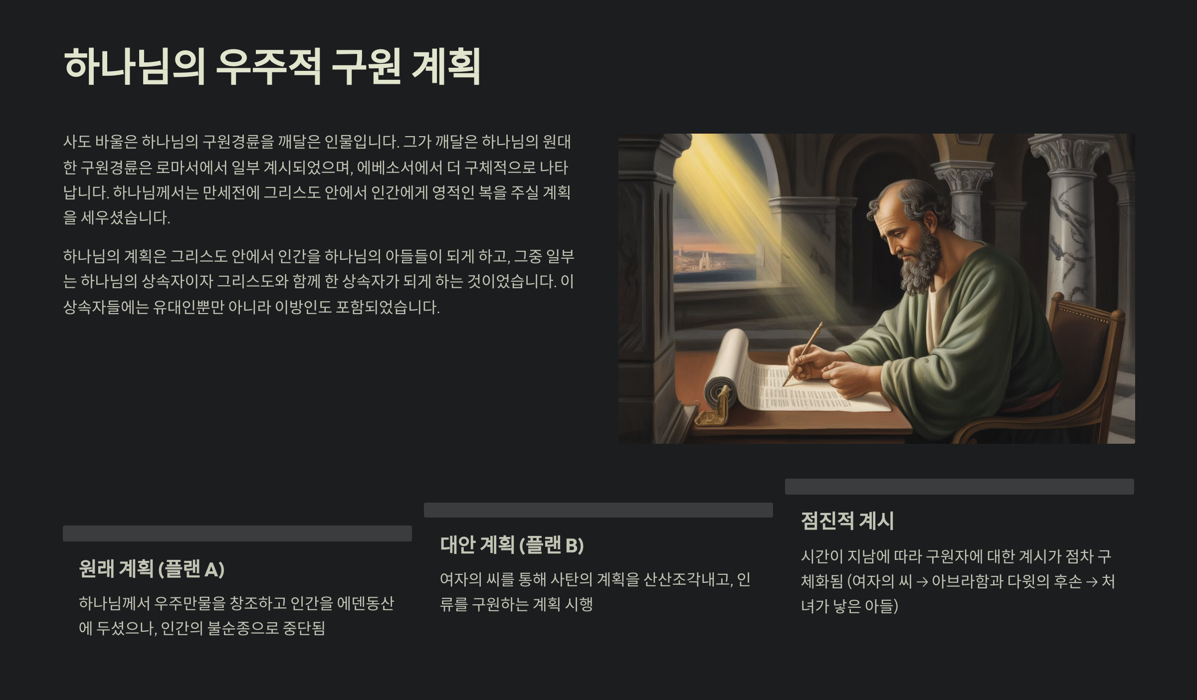 성경에 보면 하나님의 구원경륜이 무엇인지를 정확히 깨달았던 인물이 나온다. 그는 바로 사도 바울이다. 신약의 사도였던 바울은 셋째 하늘에 올라갔고 그리고 낙원에 가서 하나님께서 들려주신 어떤 말씀을 들은 사람이다. 그래서인지 그는 그동안 다른 성경인물들은 말하지 못했던 원대한 하나님의 구원경륜을 받아서 기록으로 남길 수가 있었다. 그런데 그가 깨달은 하나님의 원대한 구원경륜은 로마서에서 조금은 계시되어 있다(롬8:16~18). 하짐만 에베소서에서 구체적으로 나타난다. 그것은 한 마디로 이렇다.