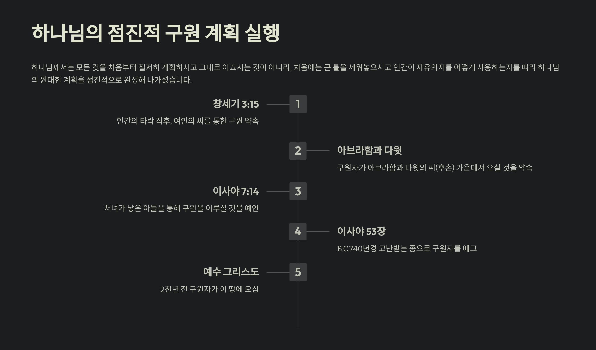 나님께서는 모든 것을 처음부터 철저히 계획하시고 그대로 이끄시는 것이 아니라, 처음에는 큰 틀을 세워놓으시고 인간이 자유의지를 어떻게 사용하는지를 따라 하나님의 원대한 계획을 점진적으로 완성해 나가신 것이다.그러므로 하나님께서는 아담과 하와의 범죄 이후 곧바로 인간을 구원하기로 결정을 내리셨지만 그 계획을 어떻게 집행하실 것인지에 대해서는 많이 고민을 하신 것 같다. 이때 하나님께서는 가장 먼저 인간의 타락직후 창세기 3장 15절의 말씀을 통하여 여인의 씨를 통하여 인류를 구원해주실 것이라고 약속하셨다. 그리고 점차 그 계획을 구체적으로 알려주셨는데, 그것은 구약의 율법과 선지서를 통하여 확인해 볼 수가 있다. 특히 하나님께서는 약속된 구원자를 보내시되, 단지 인류의 죄값만을 치르기 위해서만 보내는 것이 아니라, 인간의 저주까지도 담당하실 자를 보내기로 결정하신다. 이는 율법말씀에는 전혀 예고된 적이 없던 것이었다. 하지만 하나님께서는 B.C.740년경 이사야 선지자의 말씀을 통하여 하나님께서 보내실 구원자를 고난받는 종으로 예고하셨다. 그리하여 지금으로부터 2천년전에 구원자가 이 땅에 오신 것이다. 그렇다. 하나님이 보내실 구원자가 이 땅에 어떻게 출현하게 될 것인지를 하나님께서는 약 4,000년 시간을 통하여 점차적으로 알려주신 것이다.