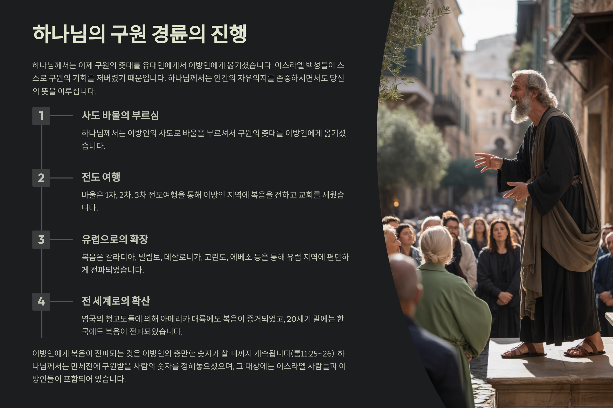 그리하여 하나님께서는 이제 구원의 촛대를 유대인에게서 이방인에게 옮기신다. 이스라엘 백성들이 스스로 구원의 기회를 저버렸기 때문이다. 그것은 하나님께서 일부러 의도한 것이 아니었다. 그들 스스로가 죄악된 길로 가서 그렇게 된 것이다. 그러므로 하나님께서는 인간의 자유의지를 그대로 존중하시면서도 당신의 뜻을 이루신다. 그것은 천국에서 하나님의 아들들이 되고 상속자가 되는 것은 유대인들만 될 수 있는 것이 아니라 이방인도 참여시킬 것을 만세전에 계획하고 계셨기 때문이다. 그러므로 하나님께서는 이스라엘이 스스로 넘어짐에 따라 자연스럽게 구원의 촛대를 이방인에게도 옮기신 것이다. 그것은 이방인의 사도로 부름받은 사도 바울을 통해서 이루셨다(롬11:13). 유대인이면서 이방인에게 복음을 전하는 것을 꺼리지 않았던 사도 바울을 하나님이 쓰신 것이다. 그리하여 사도 바울은 1차전도여행과 2차전도여행 그리고 3차전도여행을 통하여 이방인지역에 복음을 전해주고 교회를 세운다. 그때 세워진 교회들이 바로 갈라디아 교회, 빌립보 교회, 데살로니가 교회, 고린도 교회, 에베소 교회 등이다. 그리하여 복음은 유럽지역에 편만하게 전파된다. 그리고 영국의 청교도들에 의해 아메리카 대륙에도 복음이 증거되었고, 20세기말에는 한국에도 복음이 전파되었다.
