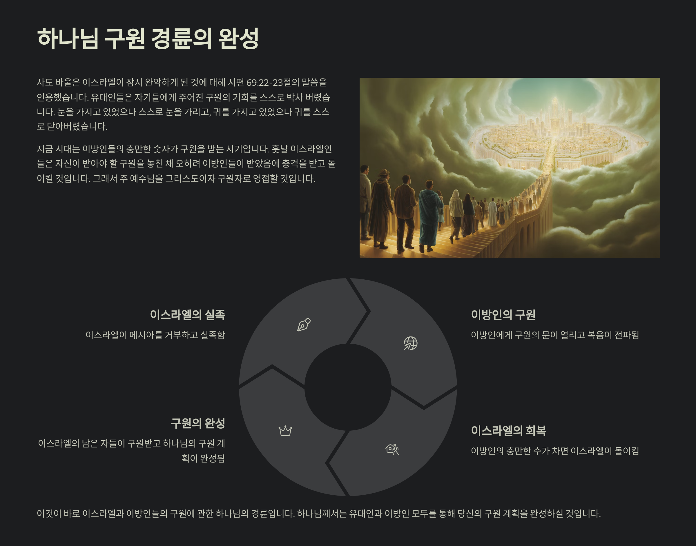 사도 바울은 이스라엘이 잠시 완악하게 된 것에 대해 시편 69:22~23절의 말씀을 인용하였다(롬11:9~10). 그것은 "그들의 밥상이 올무가 되게 하시며 그들의 평안이 덫이 되게 하소서. 그들의 눈이 어두워 보지 못하게 하시며 그들의 허리가 항상 떨리게 하소서(시69:22-23)"라고 하는 말씀이었다. 그런데 이 말씀은 사6:9~10의 말씀과 비슷하다. "여호와께서 이르시되 가서 이 백성에게 이르기를 너희가 듣기는 들어도 깨닫지 못할 것이요 보기는 보아도 알지 못하리라 하여, 이 백성의 마음을 둔하게 하며 그들의 귀가 막히고 그들의 눈이 감기게 하라 염려하건대 그들이 눈으로 보고 귀로 듣고 마음으로 깨닫고 다시 돌아와 고침을 받을까 하노라(사6:9-10)" 그렇다. 유대인들은 자기들에게 주어진 구원의 기회를 그들은 스스로 박차 버린 것이다. 눈을 가지고 있었으나 스스로 눈을 가려버린 것이요, 귀를 가지고 있었으나 귀를 스스로 닫아버린 것이다. 그리하여 이방인에게 구원의 촛대가 옮겨져서 이방인들도 구원받을 수 있는 기회가 주어진 것이다. 그래서 지금 시대는 이방인들의 충만한 숫자가 구원을 받는 시기다. 훗날 이스라엘인들은 자신이 받아야 할 구원을 놓친채 오히려 이방인들이 받았음에 충격을 받고 돌이킬 것이다. 그래서 주 예수님을 그리스도이자 구원자로 영접할 것이다. 그리하여 이스라엘의 남은 자들이 구원을 받게 될 것이다. 그리하여 이스라엘들 중에 구원받을 남은 숫자가 채워질 것이다. 이것이 바로 이스라엘과 이방인들의 구원에 관한 하나님의 경륜인 것이다.