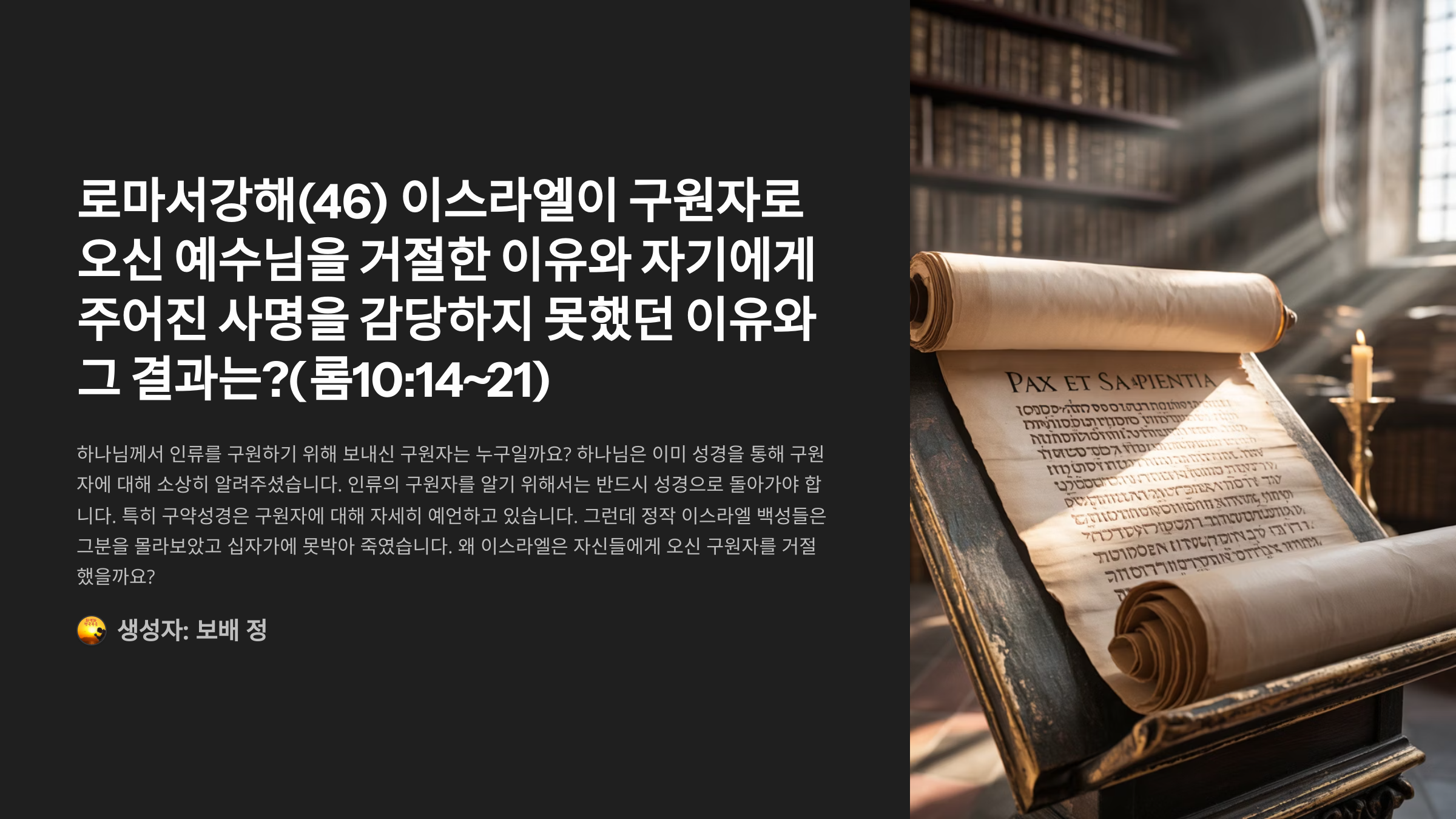 제목: [로마서강해(46)] 이스라엘이 구원자로 오신 예수님을 거절한 이유와 자기에게 주어진 사명을 감당하지 못했던 이유와 그 결과는?(롬10:14~21)_2026-06-20(금)