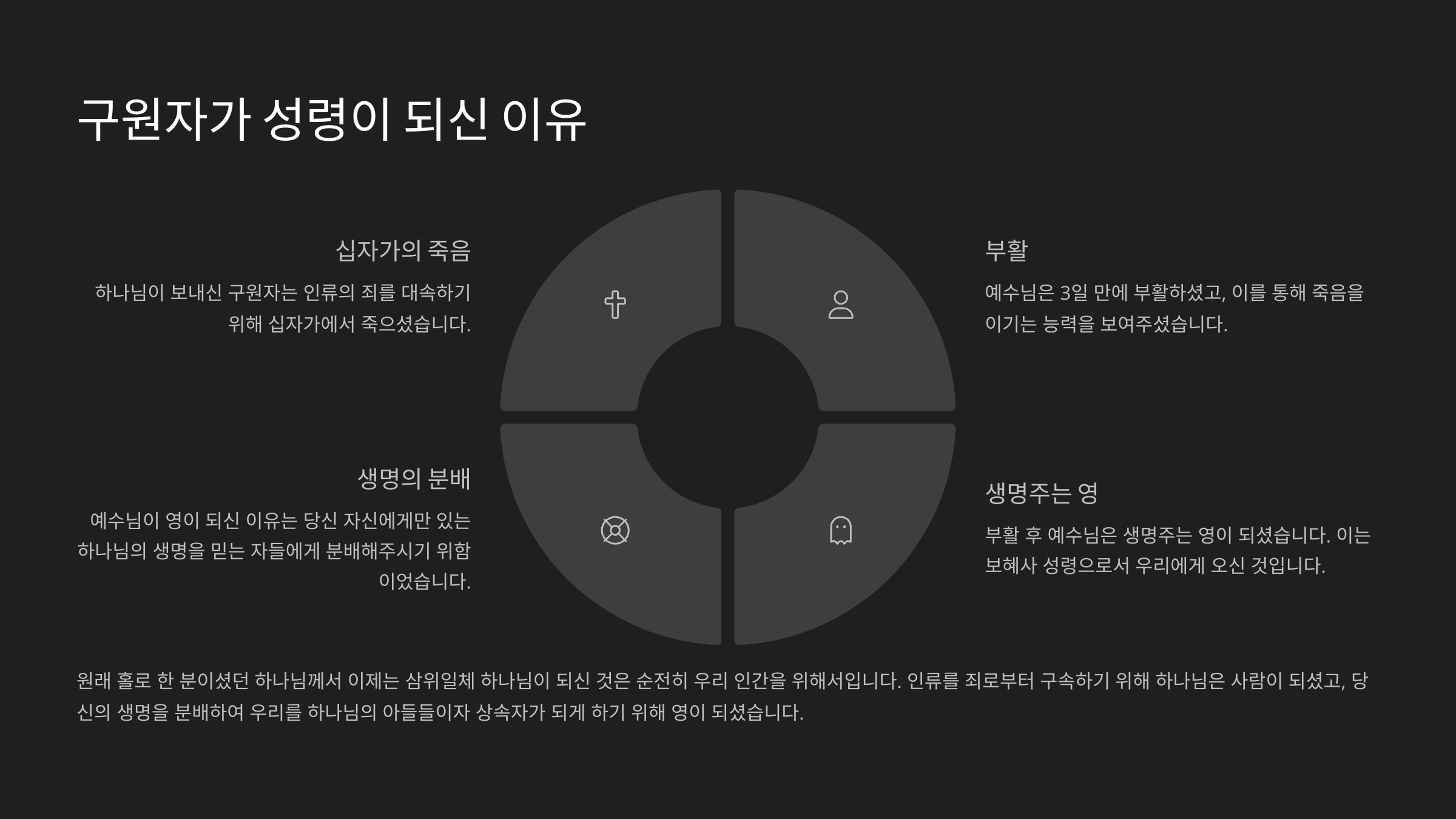 그래서 하나님이 보내신 구원자는 인류의 죄를 대속하기 위해 십자가에서 죽으시고 3일만에 부활하셨다. 그리고 나서 그분은 생명주는 영이 되셨다(고전15:45). 그분이 바로 예수께서 보내시겠다고 약속한 보혜사 성령이시다. 고로 보혜사 성령께서는 단독적인 삼위일체 하나님이시지만 동시에 예수님의 또 다른 오심이라고 할 수 있다. 다 한 분 하나님께서 일하시는 것이다. 왜 그럼, 사람이셨던 예수께서는 영이 되신 것인가? 그것은 당신 자신에게만 있는 하나님의 생명을 이제 해방시켜 당신을 믿고 따르는 자들에게 분배해주시기 위함이었다(요12:24). 그분이 죽지 않고 있으면 하나님의 생명을 가진 한 알의 밀알만 되시겠지만 그분이 죽고 부활하시어 성령이 되심으로 모든 사람들에게 바람처럼 숨처럼 집어넣어줄 수 있기 때문이다. 그래서 하나님께서는 이제 사람이셨던 아들에서 영이 되신 것이다.