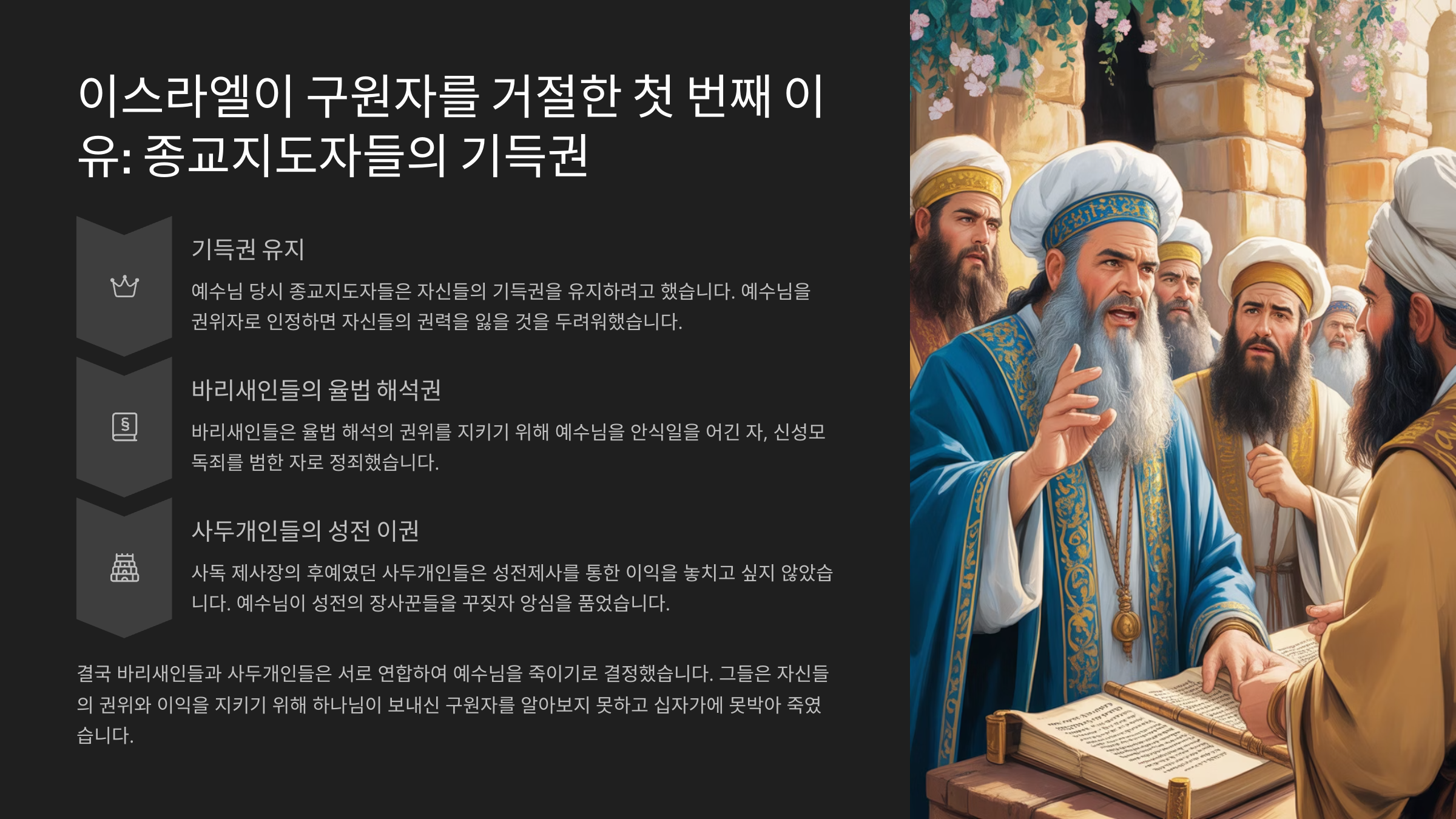 첫째, 하나님이 보낸 구원자를 이스라엘이 거절했던 첫 번째 이유는 기득권을 유지하려고 했던 종교지도자들 때문이었다. 이는 예수님 당시 그들이 가지고 있던 기득권을 내려놓지 않으려고 했기 때문이다. 그것을 그대로 유지하려면 예수님을 권위자로 인정해서는 아니 되었기 때문이다. 기득권을 가진 그들은 예수님의 사역을 조직적으로 방해하였고 그리고 평소 원수로 지내던 정치세력과 야합하여 예수님을 죽이는 일을 계획하였다. 그럼, 왜 종교지도자들이 이렇게 되었을까? 그것은 그들이 가진 기존의 권력을 내려놓지 않으려고 한 것이었다. 하나는 바리새파 사람들에 의해서 자행된 것이었고 또 하나는 사두개파 사람들에 의한 것이었다. 사실 바리새인들은 그간 율법해석자를 넘어서 사람의 범죄를 심판하는 심판자의 역할을 하고 있었다. 그리고 백성들로부터 존경을 받고 있었다. 하지만 어떤 것은 월권행위를 하는 것이었다. 하지만 바리새인들은 자기가 받아왔던 존경을 내려놓고 싶지 않았다. 그런데 율법에 새로운 해석을 하는 분이 나타났다. 그리고 사람들이 그분에게 가기 시작했다. 그러자 바리새인들은 율법의 규정들을 가지고 예수님은 정죄하였다. 안식일을 어긴 자라고 말이다. 자신이 사람이면서 하나님의 아들이라고 하여 신성모독죄를 범하고 있다고 말이다. 하나님께서 인류를 구원하기 위해 사람으로 오셨는데 그들은 몰라보았고 정확히 말하면 그렇게 아니보려고 하였던 것이다. 그렇다. 바리새파 종교지도자들은 예수님을 인정하면 자신들의 권위와 자리를 잃을까 매우 두려워하였던 것이다. 그래서 바리새파 사람들은 율법 해석의 권위를 자신이 가지고 있는 것을 지키기 위해 안간힘을 썼다. 그리고 결국에 가서는 예수님을 제거하기로 결정한 것이다. 그러면, 또 다른 종교지도자들이었던 사두개인들은 어뗘했는가? 다윗시대에 임명한 대제사장 사독 제사장의 후예였던 사두개인들은 성전제사의 모든 것을 담당하고 있었다. 하지만 예수께서 나타나시더니 제물을 이용하여 장사하고 동전교환으로 장사하고 있는 그들을 엄히 꾸짖으셨다. 그러자 사두개인들은 성전을 이용한 자신들의 이익을 놓치고 싶지 않았다. 그래서 예수님에 대해 앙심을 품었다. 그리고는 바리새인들과 연합하여 예수님을 죽이기로 결정한 것이다. 그리하여 정말로 예수님을 십자가에 못박아 죽게 하였다.