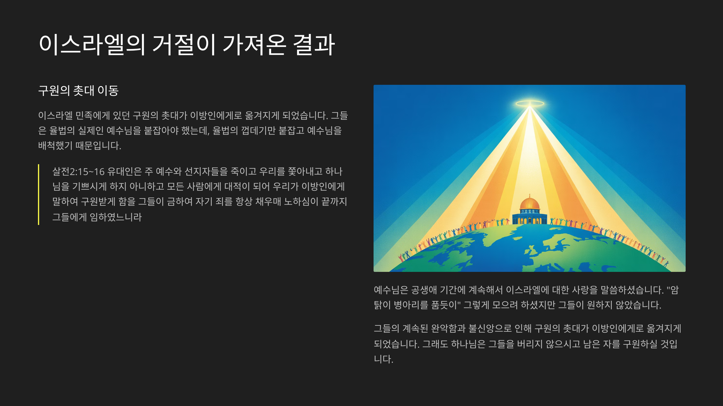 그 결과, 이스라엘 민족에게 있던 구원의 촛대가 이방인에게로 옮겨지고 말았다(롬11:11). 그들은 율법의 실제가 말씀하고 있는 바 예수님을 붙잡아야 했는데, 율법의 겁데기만 붙잡고 예수님을 배척했기 때문이다. 그러므로 2차전도 여행 중 데살로니가에 있을 때 사도 바울은 유대인의 죄를 이렇게 지적하였다.