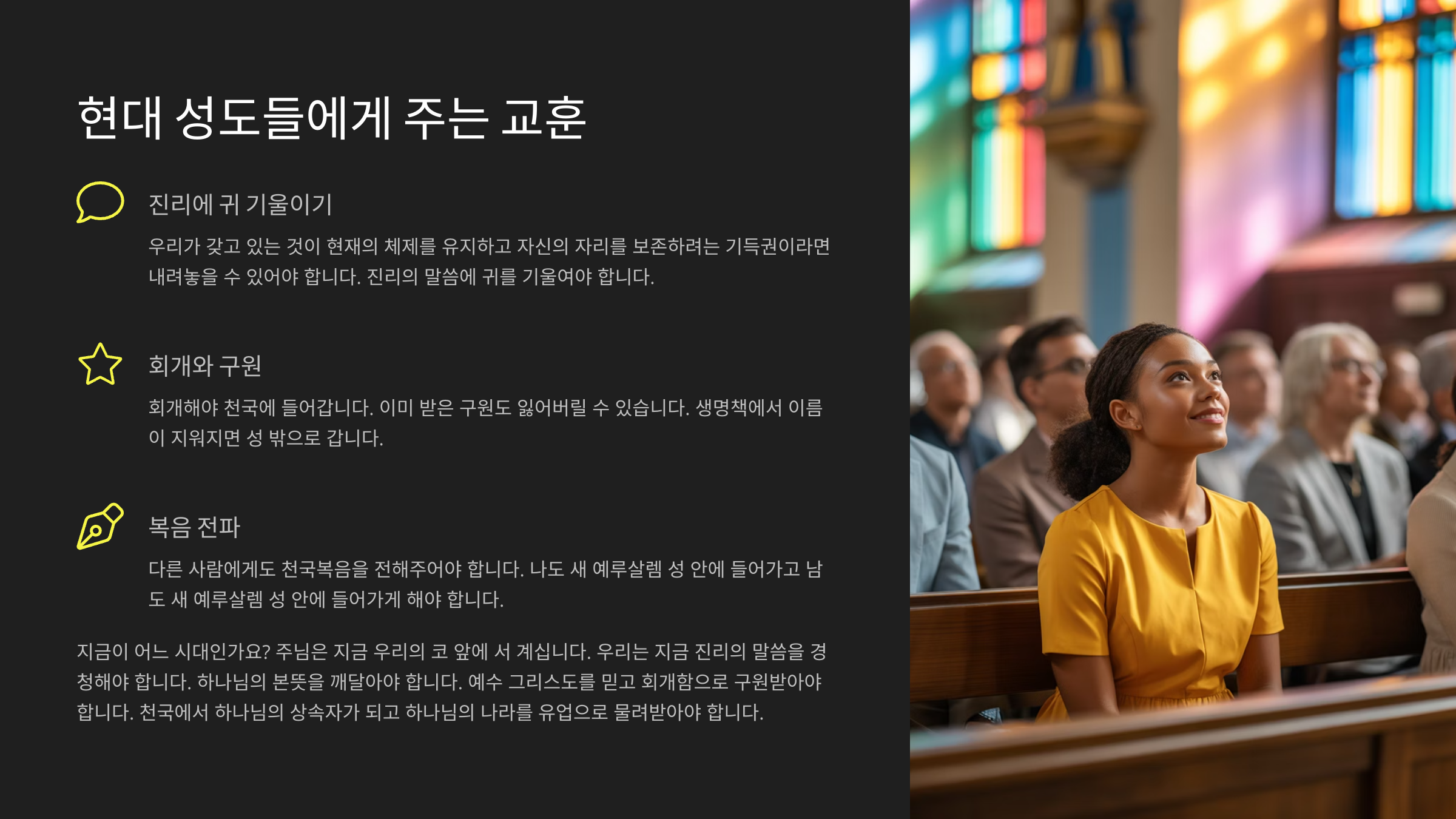 고로 현대를 살아가고 있는 우리 성도들에게 유대인들과 같은 것이 있지 않나 돌아보아야 한다. 우리가 갖고 있고 주장하고 있는 것이 또한 현재의 체제를 유지하고 자신의 자리를 보존하려고 하는 기득권이라면 그것을 내려놓을 수 있어야 한다. 진리의 말씀에 귀를 기울여야 한다. 그래서 하나님께서는 이제 마지막 때가 되다보니 진리의 말씀들을 여러 종들을 통하여 전하고 계신다. 하나님은 삼위일체 하나님이지만 한 분이시다. 구원은 영원히 구원받으려고 주신 것이지만 실제는 다 구원받지 못한다. 개인에 관한 구원예정은 한 사람도 있지 않다. 회개해야 천국에 들어간다. 천국은 새 예루살렘 성 안에 들어가는 것이다. 이미 받은 구원도 잃어버릴 수 있다. 생명책에서 이름이 지워지면 성밖으로 간다. 한 번 생명책에서 지워진 이름은 다시 쓰이지 않는다. 천국에 들어간 성도들의 지위와 신분이 같지 않다. 천국집도 각각 다르다. 천국에서의 지위와 신분 그리고 상은 이 땅에 수고한대로 받게 되는 것이다. 주님은 환난후에 오실 것이다. 천년왕국은 하늘에서 이뤄지고 있다. 사람의 원죄의 실체는 귀신들과 뱀들이다. 예수께서 잉태되실 때에는 귀신들과 뱀들의 공격을 받지 않도록 보호하셨다. 등등 수많은 영적 진리들이 이제 공개되고 있다. 하지만 기존의 교리의 틀 안에서는 받아들이기 힘든 것이 많아서 기존의 주장들을 내려놓지 못하고 있다. 그러나 우리는 교리를 따라갈 것인지 아니면 진리의 말씀을 따라갈 것인가를 결정해야 한다. 그래서 지금이라도 진리의 말씀을 따라가야 한다. 그리고 천국을 준비해야 한다. 지금이 어느 시대인가? 주님은 지금 우리의 코 앞에 서 계신다. 우리는 지금 진리의 말씀을 경청해야 한다. 하나님의 본뜻을 깨달아야 한다. 예수 그리스도를 믿고 회개함으로 구원받아야 한다. 다른 사람에게도 천국복음을 전해주어야 한다. 그래도 나도 새 예루살렘 성 안에 들어가고 남도 새 예루살렘 성 안에 들어가게 해야 한다. 그리고 기왕 천국에 들어갈 바에야 천국에서 하나님의 상속자가 되고 하나님의 나라를 유업으로 물려받아야 한다. 기왕이면 천국에서 주인노릇하고 왕노릇하는 자가 되어야 한다. 그런데 그날이 우리에게 너무나 가까이 다가온 채 있다.