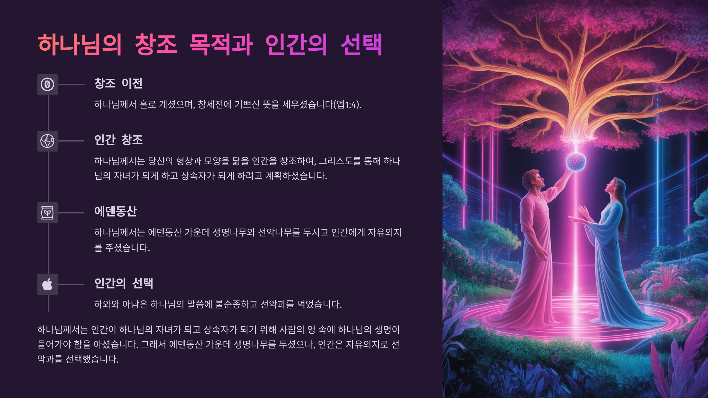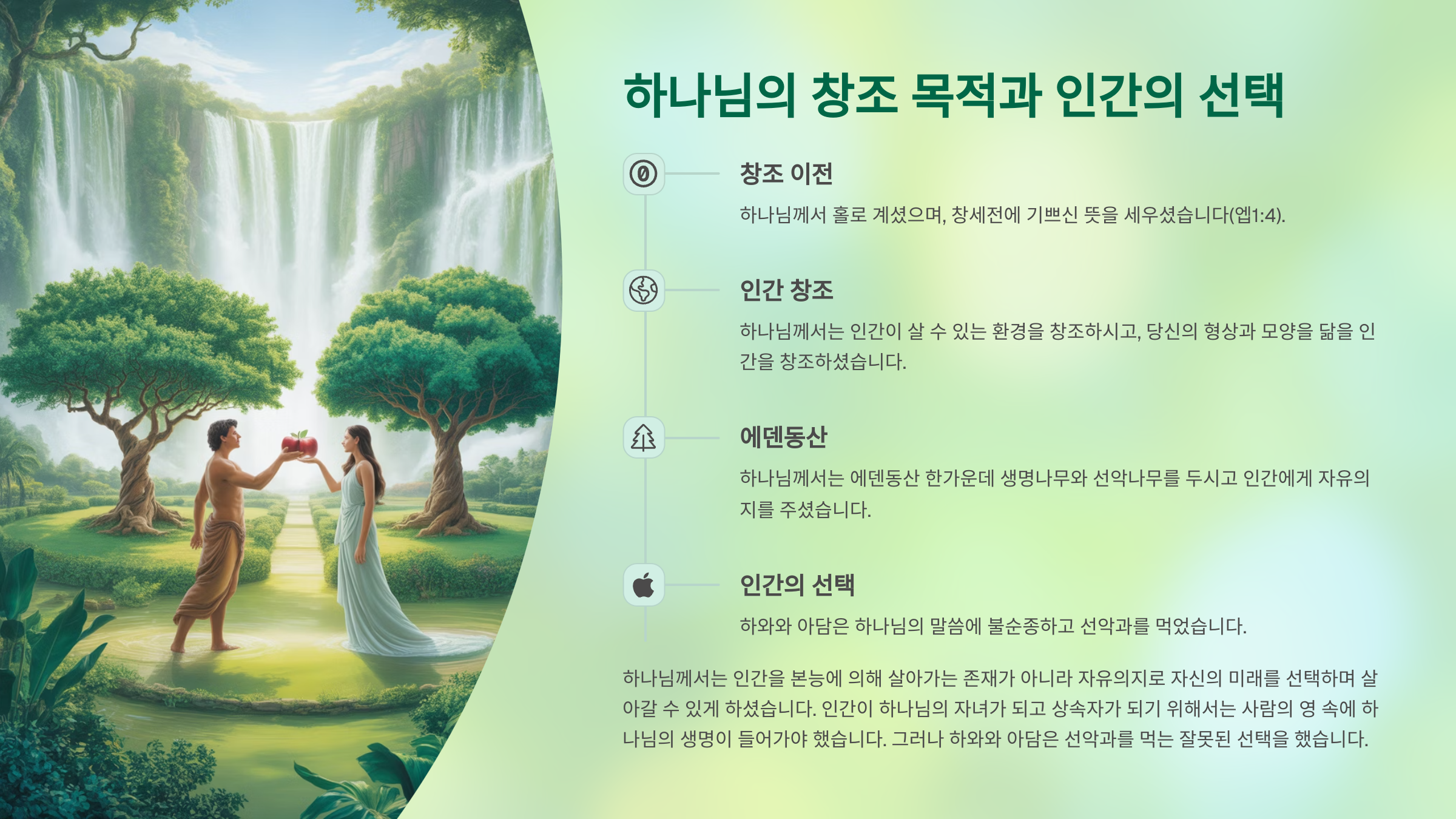 하나님께서 온 우주만물을 창조하기 전에 그분은 홀로 계셨다. 홀로 스스로 존재하는 신적 존재였던 것이다(출3:14~15). 그런데 그분이 창세전에 어떤 기쁘신 뜻을 세웠으니(엡1:4), 그것은 당신의 형상과 모양을 닮을 인간을 창조하여, 그리스도를 통해 하나님의 자녀가 되게 하고 더 나아가서는 하늘의 상속자가 되게 하려고 계획하신 것이다(엡1:3~5). 이를 위하여 하나님께서는 인간이 살 수 있는 환경을 창조하시고 이어서 인간이 하나님의 자녀가 되고 상속자가 되도록 창조하셨다. 고로 하나님께서 창조한 지구는 사람이 살기에 가장 적합한 환경을 갖추고 있었다. 그리고 하나님께서는 지구에 있는 땅의 흙으로 사람의 육체를 빚으신후에 그 코에 하늘로부터 영을 불어넣어 살아있는 혼적 인 존재가 되게 하셨다. 그런데 이때 하나님께서는 인간을 본능에 의해 살아가는 존재가 아니라 자유의지로서 자신의 미래를 선택하며 살아갈 수 있게 하셨다.