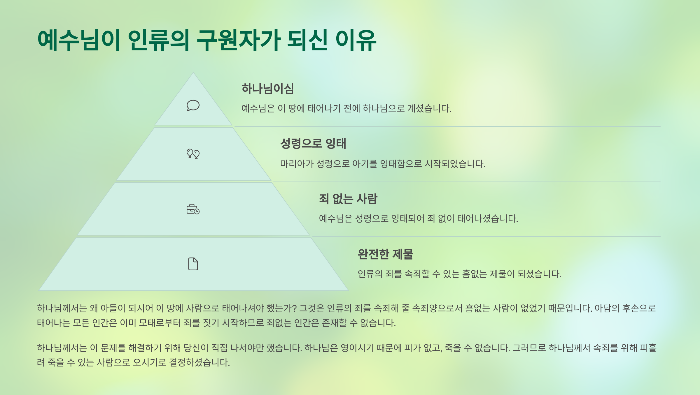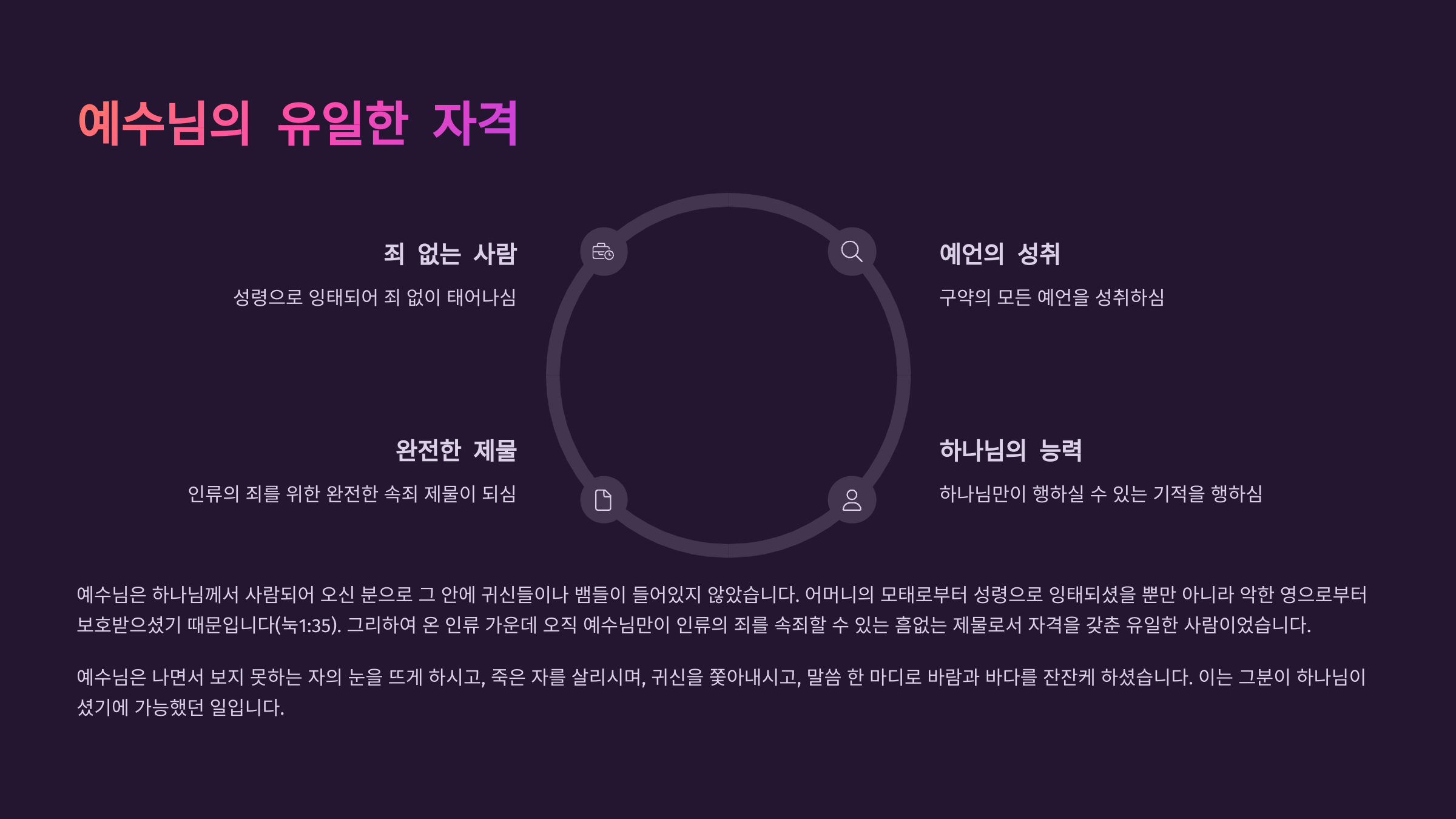 그리하여 온 인류 가운데 오직 예수님만이 하나님께서 정하신 속죄의 방법을 성취하기 위해 이 땅에 오신 분이고, 인류의 죄를 속죄할 수 있는 흠없는 제물로서 자격을 갖춘 유일한 사람이었던 것이다. 그러므로 우리는 하나님이 사람되신 분, 그래서 죄가 그 가운데 있지 아니한 분으로서 오직 예수님만이 인류를 구원할 구원자가 되실 수 있다고 말이다.