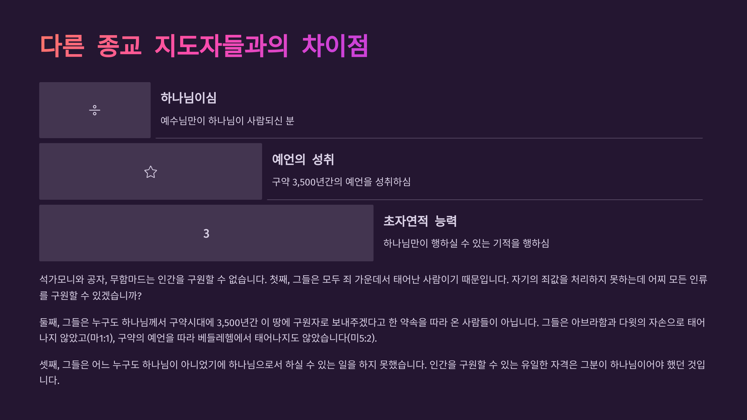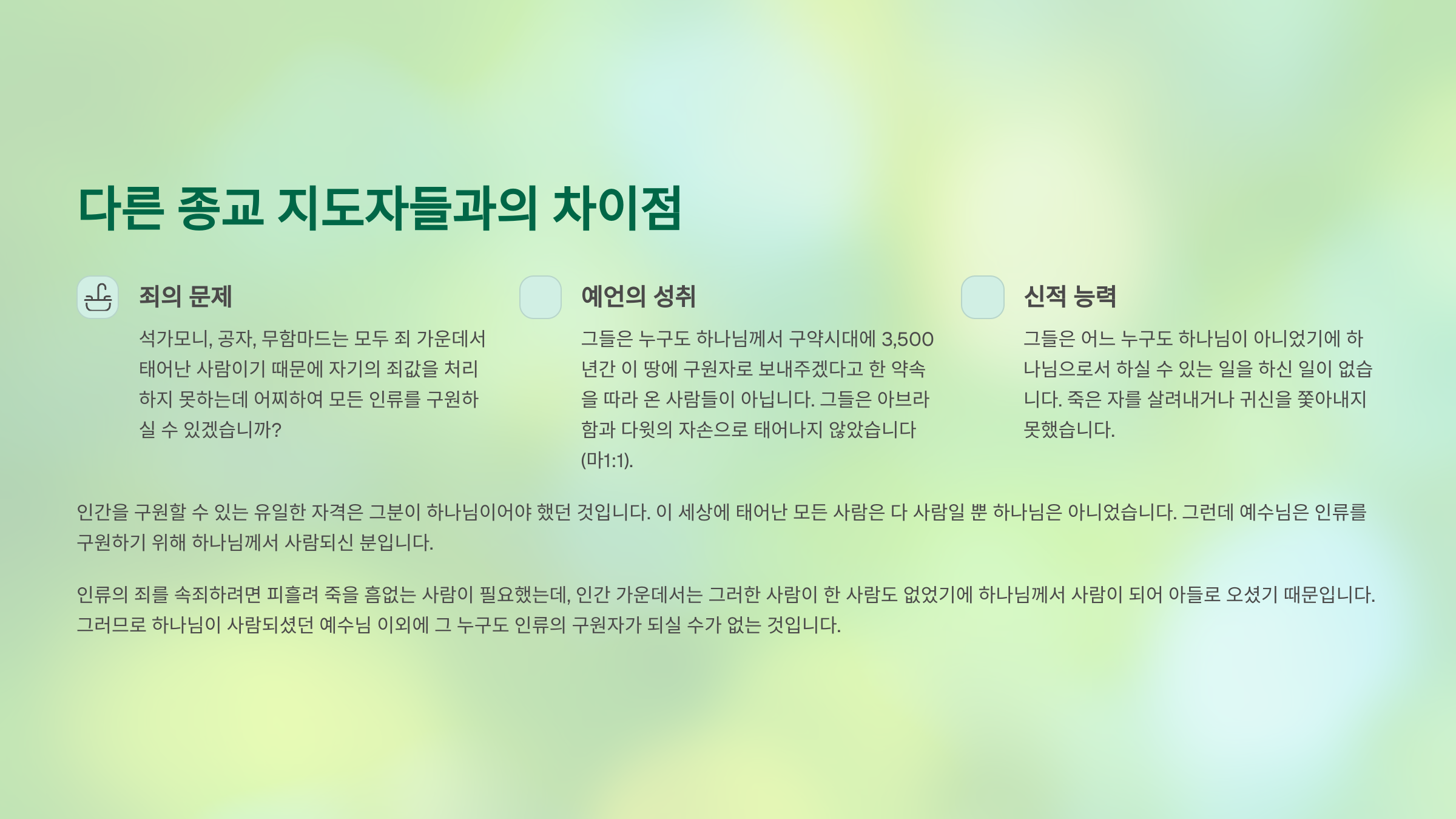 그러므로 석가모니와 공자, 무함마드는 인간을 구원할 수가 없다. 첫째는 그들은 모두 죄 가운데서 태어난 사람이기 때문이다. 그러므로 자기의 죄값을 처리하지 못하는데 어찌하여 모든 인류를 구원하실 수가 있겠는가? 둘째는 그들은 누구도 하나님께서 구약시대에 3,500년간 이 땅에 구원자로 보내주겠다고 한 약속을 따라 온 사람들이 아니기 때문이다. 그들은 어나 누구도 아브라함과 다윗의 자손으로 태어난 사람들이 아니다(마1:1). 그들은 구약의 예언을 따라 베들레헴에서 태어나지도 않았다(미5:2). 그리고 셋째로, 그들은 어느 누구도 하나님이 아니었기에 하나니으로 하실 수 있는 일을 하신 일이 없다. 즉 그들은 어느 누구도 나면서 보지 못하는 자의 눈을 뜨게 한 일이 없으며, 죽은 자를 살펴내지도 못했다. 그리고 어느 누구도 귀신을 쫓아내지도 못했다. 그리고 말씀 한 마디로 바람과 바다를 잔잔케 하신 일이 없으며, 말씀한 마디로 무화과나무의 뿌리를 마르게 하지 못했다. 그런데 예수님은 하나님이셨기에 자연만물이 그의 말에 복종하였다. 그리고 영계의 모든 피조물들이 그의 말에 복종하였다. 그러므로 사실 인간을 구원할 수 있는 유일한 자격은 그분이 하나님이어야 했던 것이다. 그러므로 이 세상에 태어난 모든 사람은 다 사람일 뿐 하나님은 아니었다. 그런데 예수님은 인류를 구원하기 위해 하나님께서 사람되신 분이다. 왜 그랬는가? 인류의 죄를 속죄하려면 피흘려 죽을 흠없는 사람이 필요했는데, 인간 가운데서는 그러한 사람이 한 사람도 없었기에 하나님께서 사람이 되어 아들로 오셨기 때문이다. 그러므로 하나님이 사람되셨던 예수님 이외에 그 누구도 인류의 구원자가 되실 수가 없는 것이다.