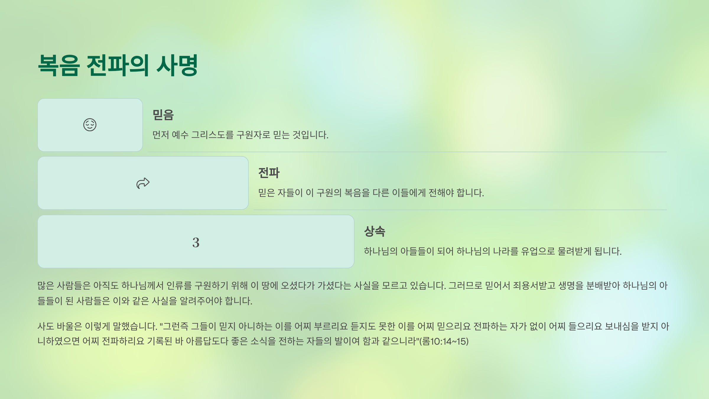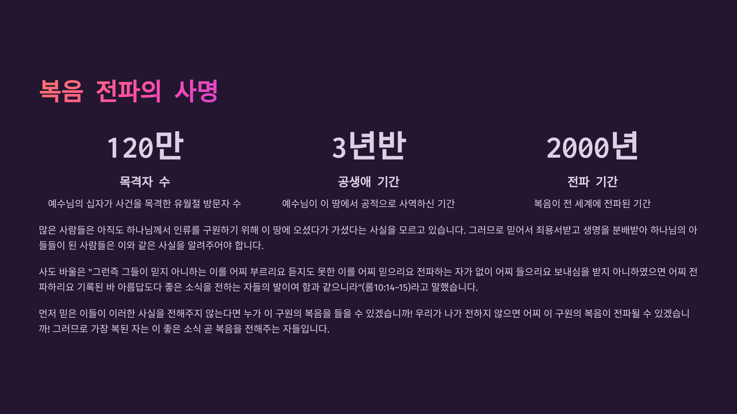 그렇다. 먼저 믿은 이들이 이러한 사실을 전해주지 않는다면 누가 이 구원의 복음을 들을 수가 있겠는가! 우리가 나가지 전하지 않으면 어찌 이 구원의 복음이 전파될 수 있겠는가! 그러므로 가장 복된 자는 이 좋은 소식 곧 복음을 전해주는 자들이다. 우리 주 예수께는 소수의 어떤 사람들만 알다가 전파된 이가 아니다. 그분이 이 땅에 오셔서 공생애를 3년반동안 사셨다는 것은 당시의 역사를 기록한 책들에게서도 발견된다. 특히 당시 유대인들은 유월절을 지키러 세계 곳곳에서 왔다가 예수께서 십자가에서 피흘려 죽으시는 것을 다 지켜보았다. 그 숫자가 120만명 정도였다고 한다. 그러니 하나님께서 이 땅에 오셨다가 인류의 죄를 속죄하고 다시 하늘로 돌아가셨다는 사실을 지금까지 아무도 부인하지 못한다. 다만 그분을 하나님이셨다는 사실을 모르고 있을 뿐이다. 하나님께서 인류의 죄를 속량하기 위해 그렇게 피흘려 죽으셨던 사실을 잘 모르고 있을 뿐이다. 그러므로 빨리 이러한 사실을 전해주어야 한다. 그래서 모든 사람이 인간을 만드신 창조주께서 인류를 위해 대신 죽으심으로 인류가 자신의 죄를 용서받고 성령으로부터 생명을 받아 하나님의 아들들이 될 수 있다는 사실을 알려주어야 한다. 그리고 이땅에 오신 주 예수님과 복음전파를 위해 수고한다면 천국에 들어갔을 때에 그가 하나님의 나라를 유업으로 물려받을 수 있는 하나님의 상속자가 된다는 것도 알려주어야 한다. 이게 바로 이미 믿은 자들 모두에게 주어진 사명인 것이다.