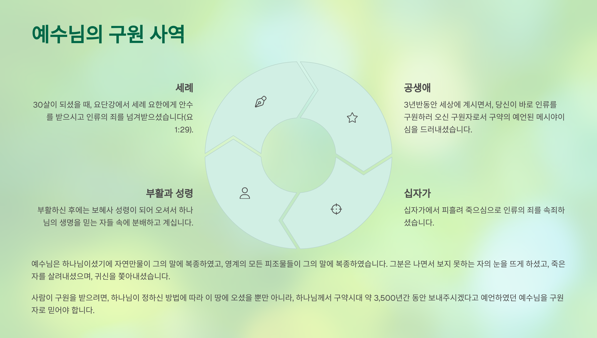 그러면 어떻게 예수님은 인류의 죄를 제거하실 수 있었는가? 그것은 그분이 피흘려 대신 죽는 방법으로 죽으시는 것이었다. 흠없는 사람으로 이 땅에 오신 예수께서는 이제 30살까지 사적인 생애를 사셨다. 그리고 제사장이 되는 나이인 30살이 되셨을 때, 요단강으로 가셨다. 그리고 인류의 대표로서 죄를 넘길 수 있는 제사장이자 선지자였던 세례 요한의 안수를 받으셨다. 그래서 인류의 죄를 넘겨받으신 후(요1:29), 3년반동안 세상에 계시면서, 당신이 바로 인류를 구원하러 오신 구원자로서 구약의 예언된 메시야이심을 드러내셨으니, 그분의 말과 행동이 바로 그것을 증언해주었다. 그래서 예수께서는 하나님이 아니라면 하실 수 없는 말씀을 하셨고, 하나님만이 하실 수 있는 능력과 큰 기적을 행하셨다. 그리고 십자가에서 피흘려 죽으심으로 인류의 죄를 속죄하시고(덮어버리시고) 부활하신 후에는 보혜사 성령이 되어 오셨다. 그리하여 하나님의 생명을 믿는 자들 속에 분배하심으로 그를 믿는 자를 하나님의 아들들이 되게 하시고 있다.