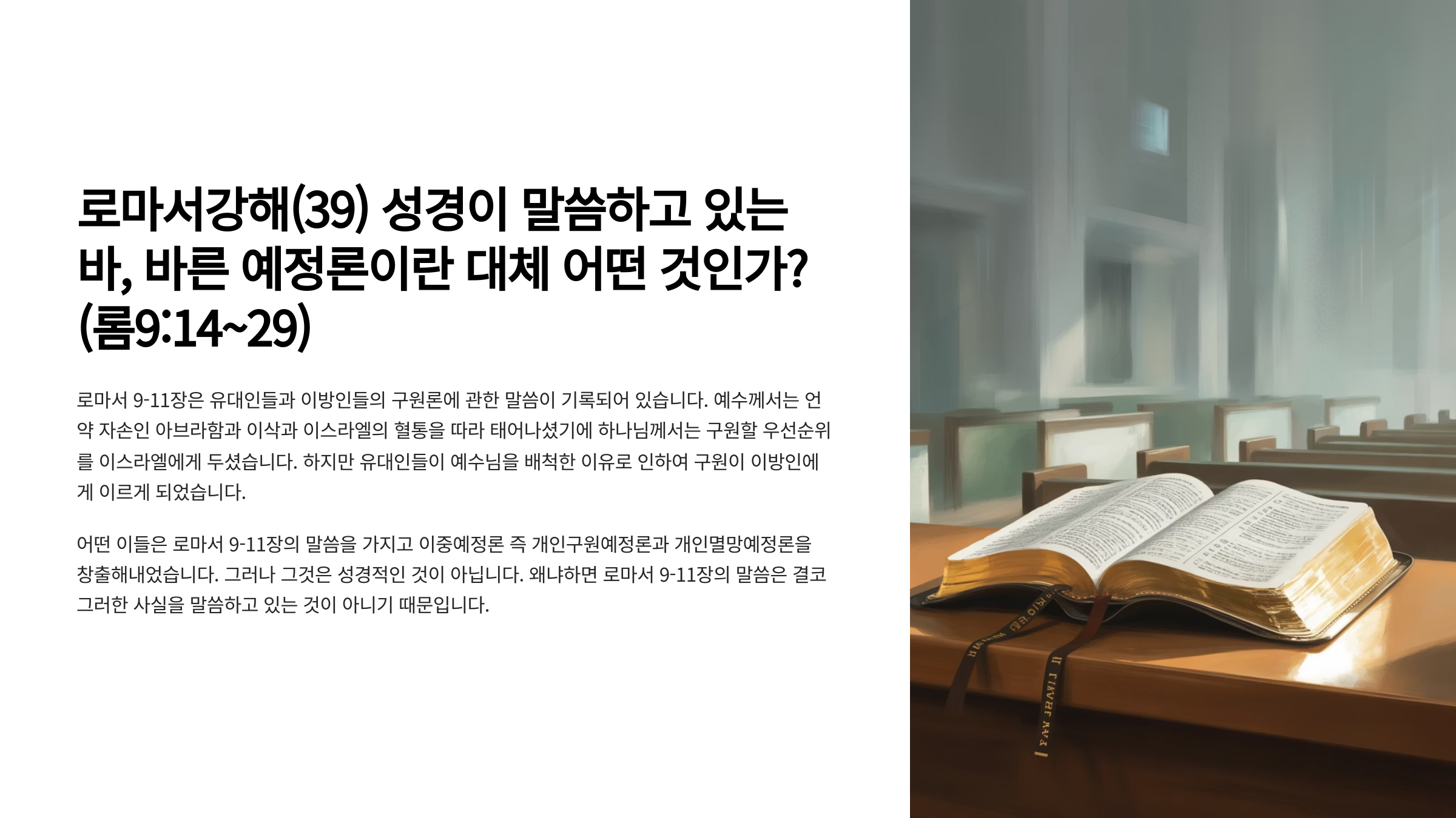 제목: [로마서강해(39)] 성경이 말씀하고 있는 바, 바른 예정론이란 대체 어떤 것인가?(롬9:14~29)_2025-06-12(목)