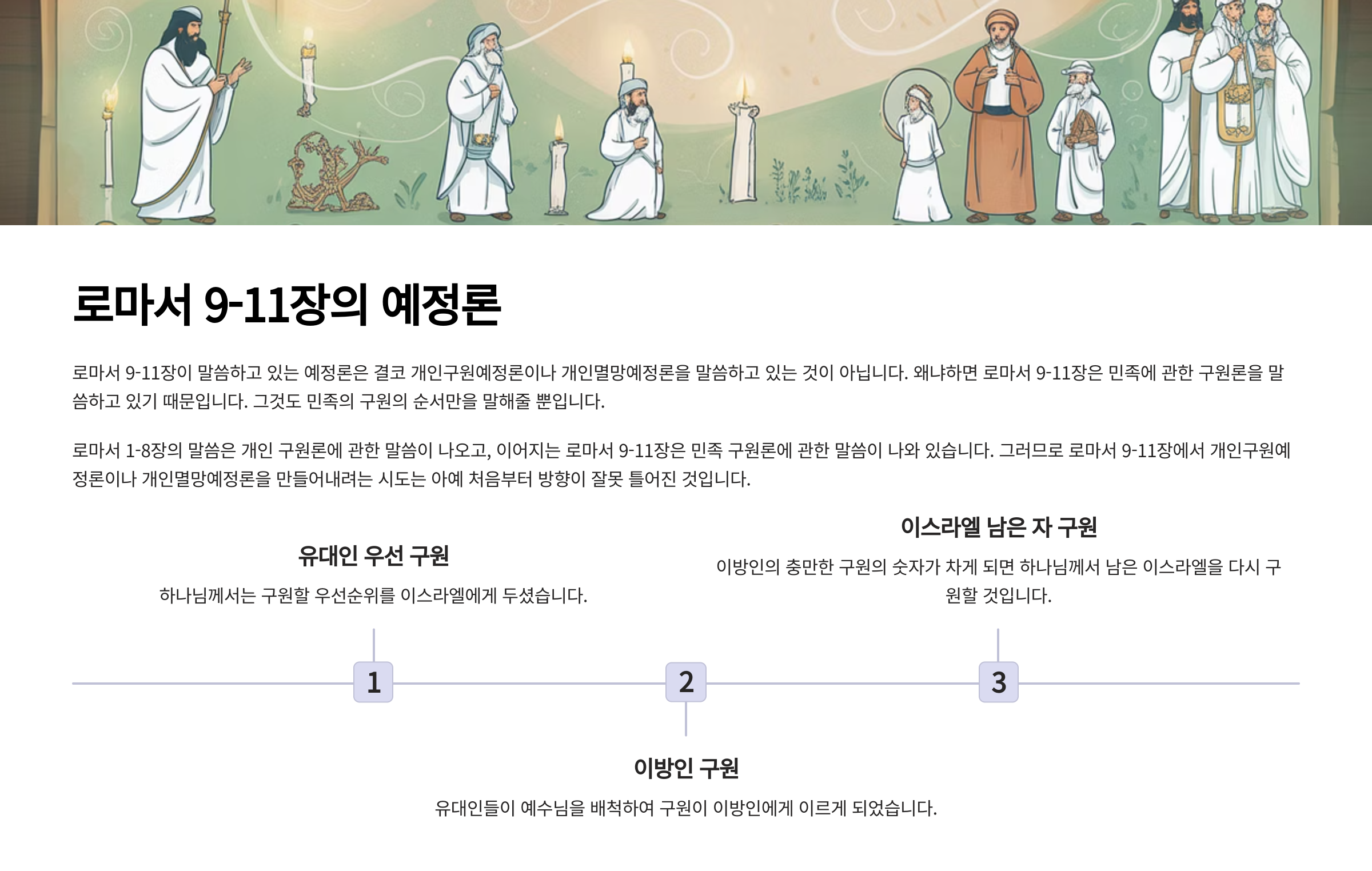 로마서 9~11장은 어떤 말씀이 기록되어 있는가? 그것은 유대인들과 이방인들의 구원론에 관한 말씀이 기록되어 있다. 그것을 요약한다면, 이렇다. "예수께서는 언약 자손인 아브라함과 이삭과 이스라엘의 혈통을 따라 태어나셨기에 하나님께서는 구원할 우선순위를 이스라엘에게 두셨다. 하지만 유대인들이 예수님은 배척한 이유로 인하여 구원이 이방인에게 이르게 되었다. 그러나 하나님께서는 이스라엘 민족을 아예 버린 것은 아니다. 잠시 완악하게 된 상태로 내버려둔 것이다. 그러나 이방인의 충만한 구원의 숫자가 차게 되면 하나님께서 이제는 남은 이스라엘을 다시 구원할 것이다. 그리하여 모든 이스라엘 곧 이기는 자들이 구원받게 할 것이다." 그런데 어떤 이들은 로마서 9~11장의 말씀을 가지고 이중예정론 즉 개인구원예정론과 개인멸망예정론을 창출해내었다. 그러나 그것은 성경적인 것이 아니다. 왜냐하면 로마서 9~11장의 말씀은 결코 그러한 사실을 말씀하고 있는 것이 아니기 때문이다. 그래서 이번 시간에는 그렇다면 로마서 9~11장에서 말씀하고 있는 예정론과 그리고 성경 전체가 말씀하고 있는 바, 바른 예정론이 무엇인지를 살펴보고자 한다.