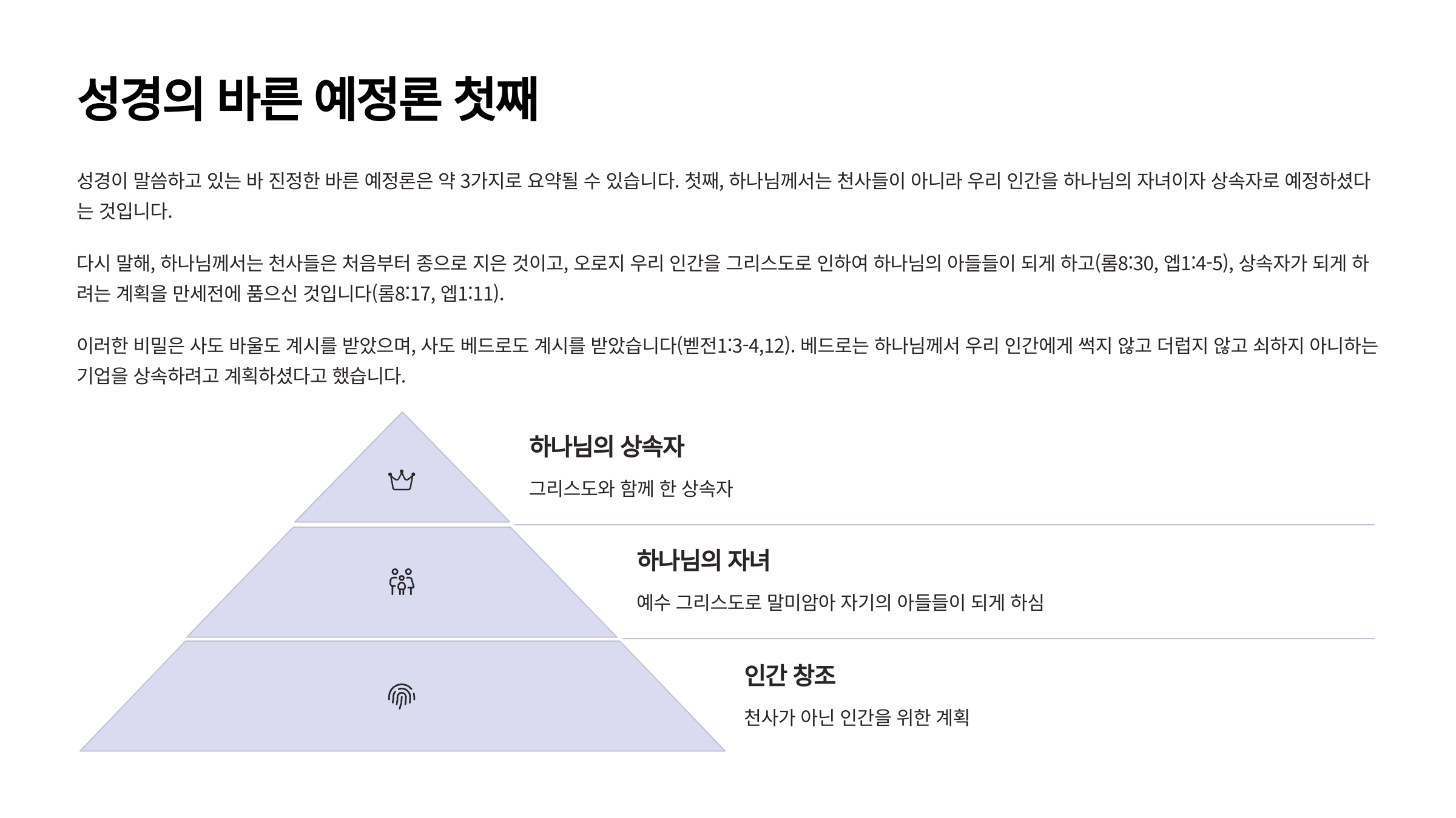 첫째, 하나님께서는 천사들이 아니라 우리 인간을 하나님의 자녀이자 상속자로 예정하셨다는 것이다. 다시 말해, 하나님께서는 천사들은 처음부터 종으로 지은 것이고, 오로지 우리 인간을 그리스도로 인하여 하나님의 아들들이 되게 하고(롬8:30, 엡1:4~5), 상속자가 되게 하려는 계획을 만세전에 품으신 것이다(롬8:17, 엡1:11). 이러한 비밀은 사도 바울도 계시를 받았으며, 사도 베드로도 계시를 받았다(벧전1:3~4,12). 그래서 사도 바울도 이것을 기록했지만 베드로도 역시 베드로전서 1장에서 말하기를 하나님께서는 우리 인간에 썩지 않고 더럽지 않고 쇠하지 아니하는 기업을 상속하려고 계획하셨다고 했다. 그것은 사실 천사들도 알고 싶어하는 것이었다고 말한다.